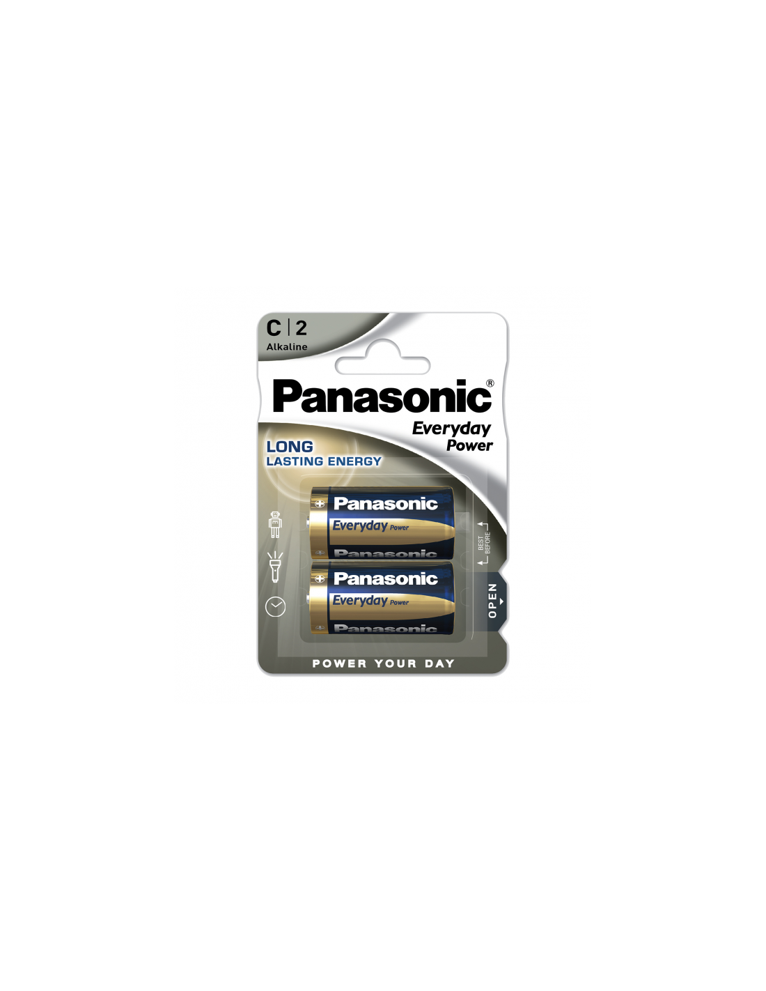 Blister de dos Pilas Alcalinas Panasonic Everyday Power C modelo LR14 de 1,5 V. Se pueden usar en una amplia gama de aplicaciones, especialmente en dispositivos de bajo consumo que requieren una potencia confiable y duradera, como básculas, controles remotos, relojes, etc. De fácil apertura. Estas pilas son de energia de larga duración.