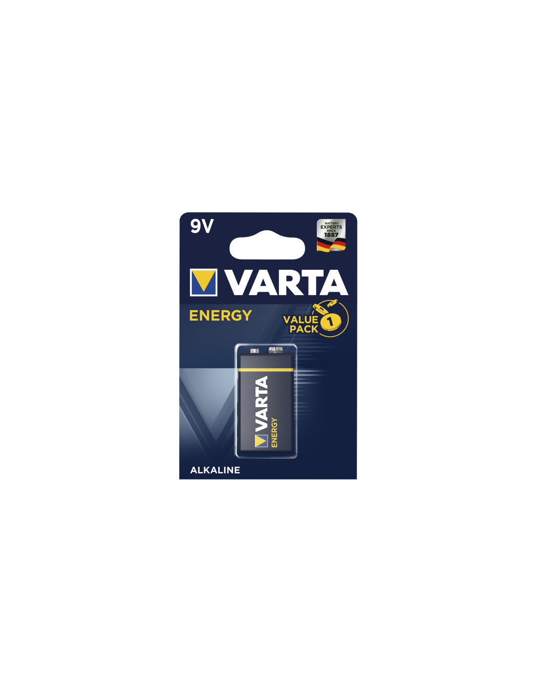 Blister de una Alcalina Varta Energy modelo LR022 y 9v. El sistema de apertura "Fresh Pack" permite sacar las pilas de una en una, y distinguir las nuevas de las usadas. Se recomienda para usos básicos como mandos a distancia, relojes y radios.