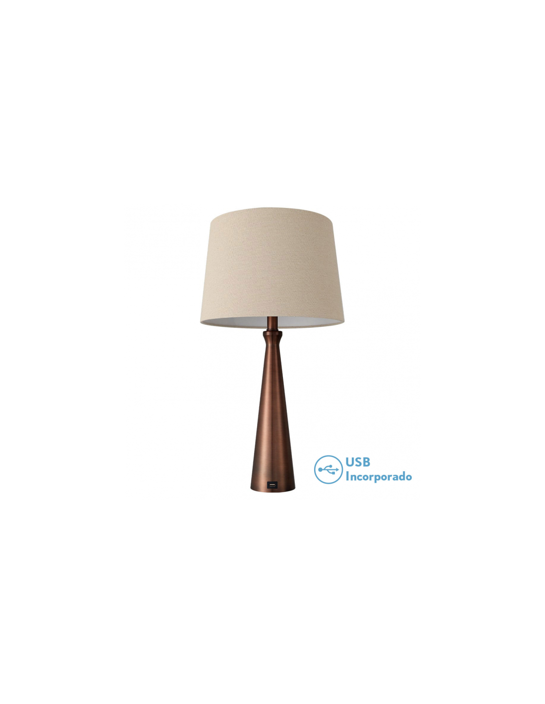 Sobremesa serie PEARL de color MARRON. Realizado en metal y material textil. Pantalla de diseño en lino beige sobre cuerpo de estilo clásico y formas elegantes para decorar e iluminar cualquier rincón de la casa aportándole personalidad y sofisticación a la estancia. Sus dimensiones son 61X33X33 centímetros. Posee un portalámparas E27. Bombilla no incluida. Dispone de PUERTO USB, que puede utilizarse para cargar sus dispositivos móviles siempre que permanezca la luz encendida. Modelo también disponible en Cuero y Níquel.