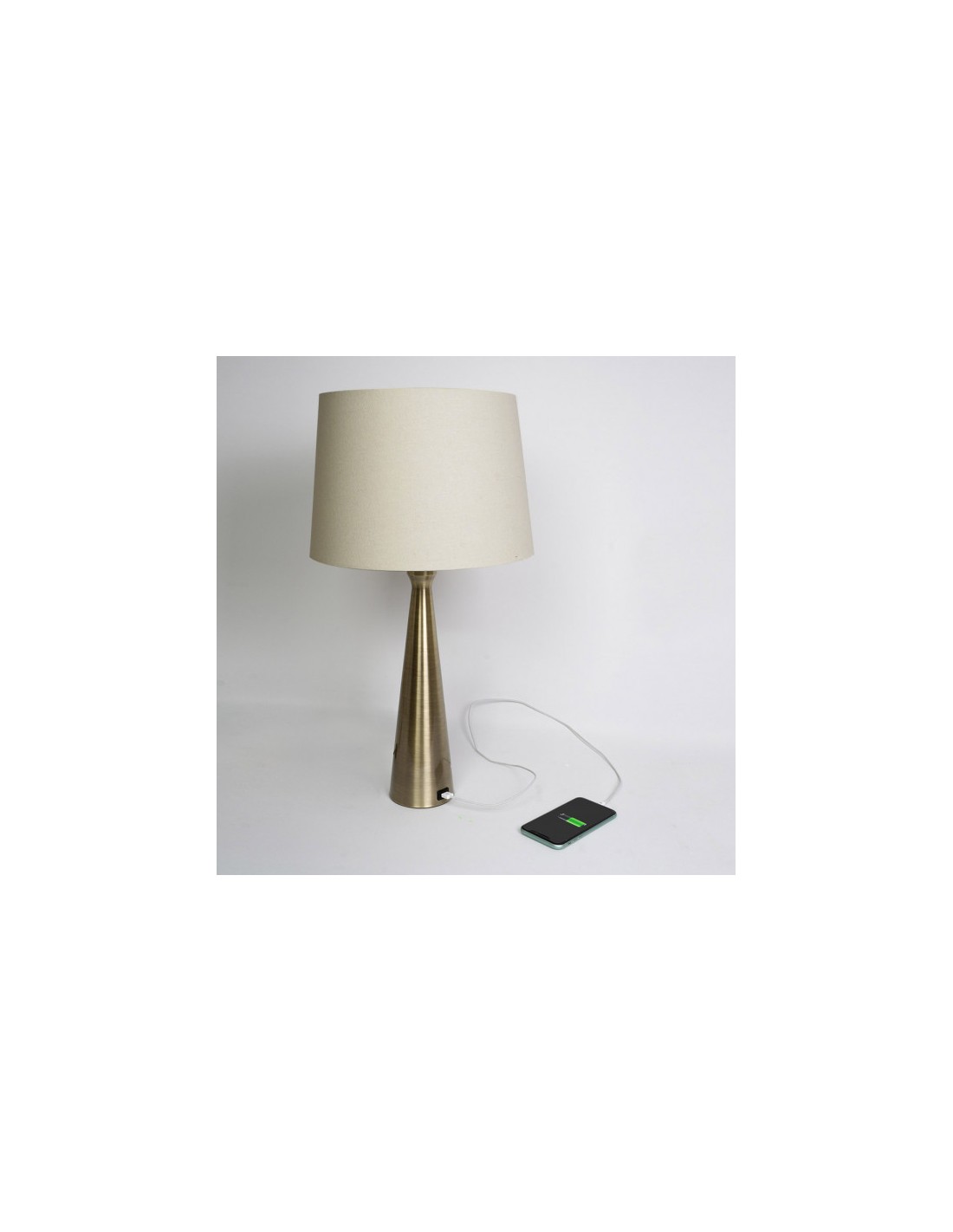 Sobremesa serie PEARL de color CUERO. Realizado en metal y material textil. Pantalla de diseño en lino beige sobre cuerpo de estilo clásico y formas elegantes para decorar e iluminar cualquier rincón de la casa aportándole personalidad y sofisticación a la estancia. Sus dimensiones son 61X33X33 centímetros. Posee un portalámparas E27. Bombilla no incluida. Dispone de PUERTO USB, que puede utilizarse para cargar sus dispositivos móviles siempre que permanezca la luz encendida. Modelo también disponible en Níquel y Marrón.