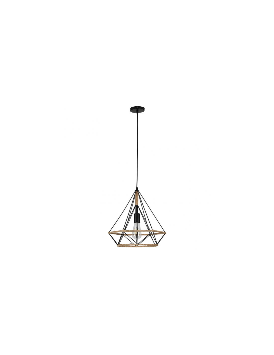 Colgante serie Yute realizado en cuerda. Esta familia se compone de un armazón de metal en el que se entrelazan gruesos hilos de cuerda que dejan ver el interior del colgante. El resultado es un diseño de un prisma muy original. Es ideal para estancias decoradas en el nuevo estilo vintage rústico. Aconsejable completar con una bonita bombilla de filamentos con la temperatura de luz que se desee dar a la estancia. Sus dimensiones son 47<,120X38X38 centímetros con altura regulable. Posee un portalámparas en E27. Disponibles varios diseños en esta misma serie, todos combinados con metal y cuerda.
