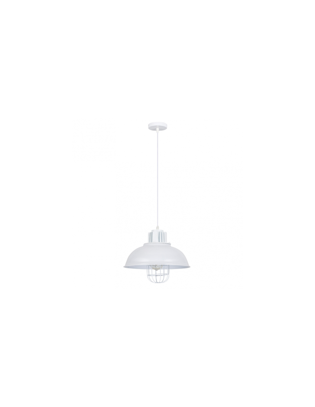 Colgante serie EMU de metal color BLANCO con rejilla protegiendo la bombilla, tipo industrial Retro. Regulable en altura tiene unas medidas de 35<,112x33x33 centímetros y un peso neto de 1225 gramos. Trae un portalámpara E27. Bombilla no incluida. Se recomienda completar con bombilla estilo vintage para conservar su estética. Disponible también en color Rústico-Plata, Marrón Óxido y Negro.