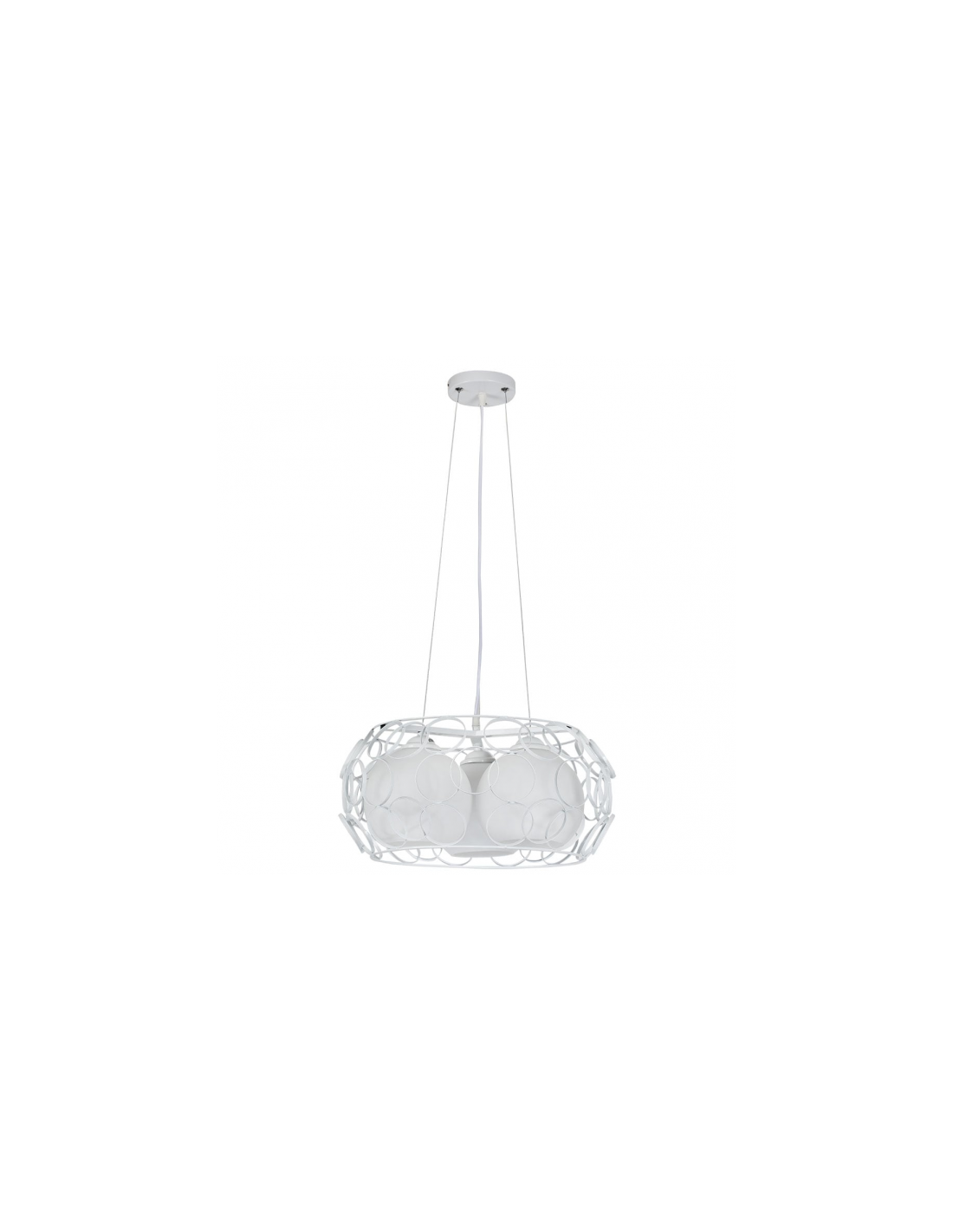 Colgante Serie PEREGRINO en color BLANCO de tres luces realizado en metal y con tulipas de cristal. El diseño moderno retro de la pantalla principal metálica combinada con las tulipas interiores ofrece un juego de luces muy peculiar. Posee tres portalámparas E27. Bombillas no incluidas. Tiene unas dimensiones de altura regulable de 40<,115X45X45 centímetros y un peso neto de 2360 gramos. Modelo también disponible en color Negro y se completa la colección con el colgante de una luz en color Negro o en Blanco.