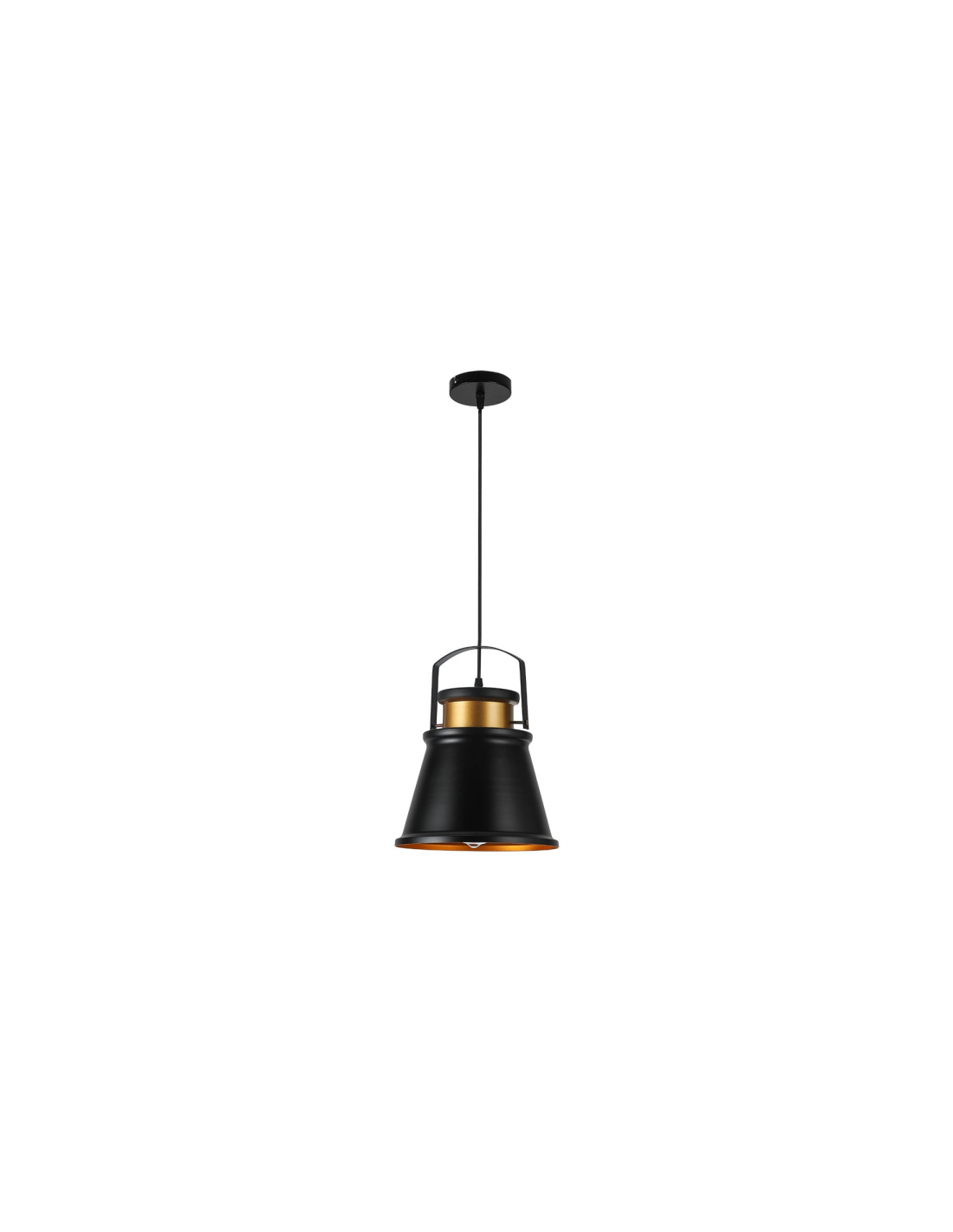 Colgante PELICANO de color NEGRO con detalle en dorado. Realizado en metal. Utiliza un porta lámparas E27. Bombilla no incluida. Es ideal para espacios de estilo Framhouse chic donde se mezclan elementos decorativos modernos con la estética rústica o de granja. Sus medidas son regulable en altura de 42<,115X25X25 centímetros. Se recomienda una bombilla de filamentos estilo vintage para realzar el tono cálido del interior de la pantalla y conservar la estética del colgante. Modelo disponible también en color Blanco.