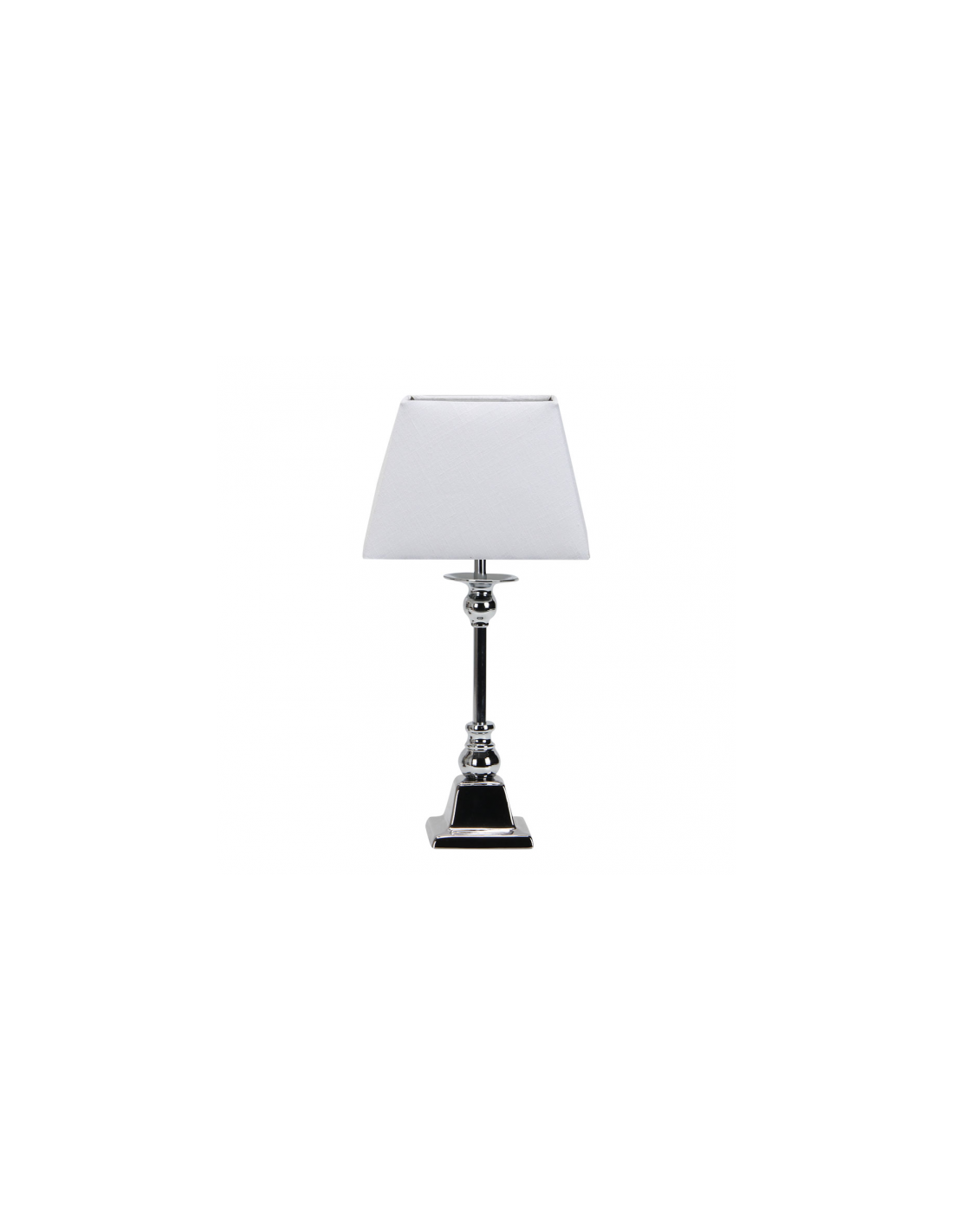 Sobremesa serie Arlequín en color CROMO de estilo clásico, sencillo y elegante con pantalla cuadrada Blanca. Portalámparas E27. Bombilla no incluida. Tiene una medida de 41X20X20 centímetros. Modelo también disponible en color Marrón Rústico/Beis.