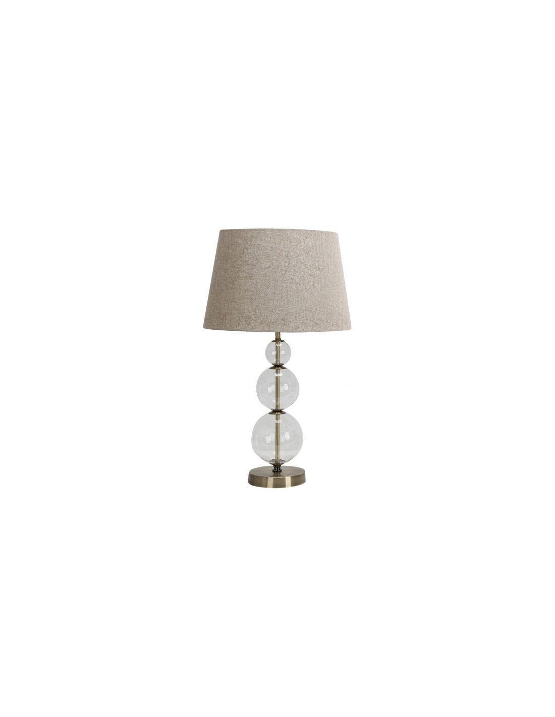 Sobremesa serie Platy en color CUERO con pantalla Beis. Cuerpo formado por tres bolas de cristal transparente de diseño original y versátil aportando elegancia y sofistificación a cualquier rincón. Portalámparas E27. Bombilla no incluida. Tiene una medida de 57X33X33 centímetros. Modelo también disponible en color Cromo/Blanco.