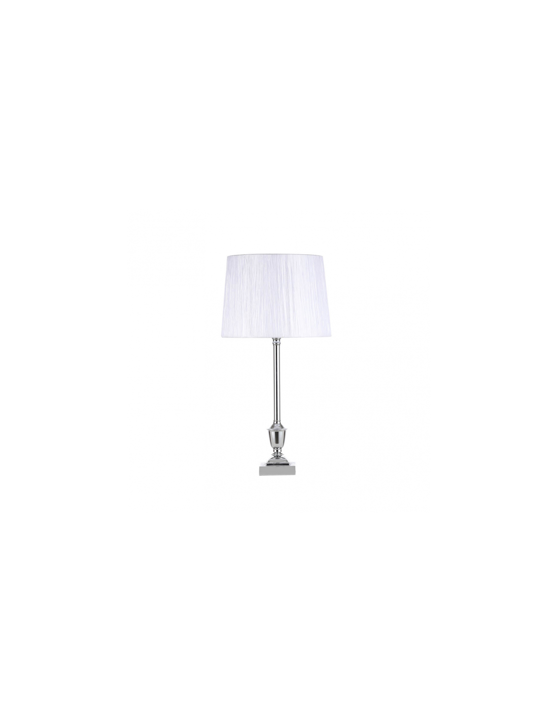 Sobremesa serie Roble en color CROMO de estilo clásico, sencillo y elegante con pantalla de tejido bambula Blanca, ideal para decorar e iluminar cualquier rincón de la casa. Portalámparas E27. Bombilla no incluida. Tiene una medida de 60.5X30X30 centímetros. Modelo también disponible en color Cuero/Beis.
