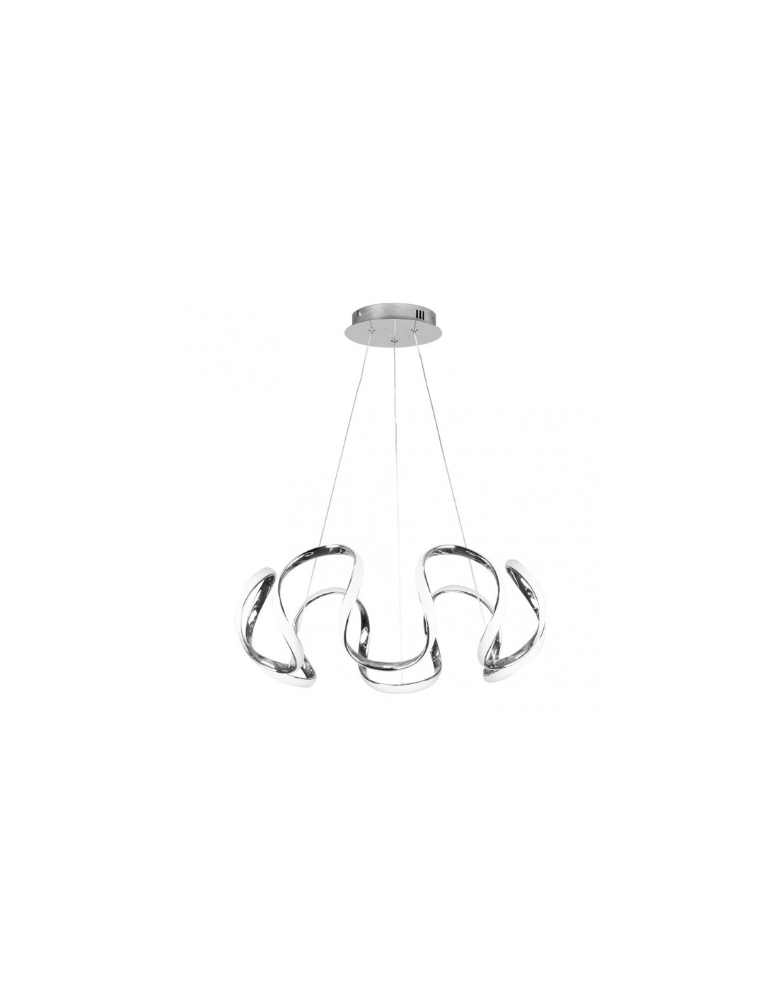 Colgante serie Nudo de color CROMO. Este moderno colgante de LED INTEGRADO está realizado en aluminio y policarbonato. Se caracteriza por su diseño con formas curvas y redondeadas dibujando un anillo con aspecto brillante resultando un juego lumínico muy interesante suspendido por tres cables. Sus dimensiones, regulables en altura son de 35<,95x60x60 centímetros. Tiene una potencia de 60 W, con 4800 lúmenes y 4000K de LUZ NATURAL. De esta misma serie puede encontrar varios diseños originales y de distintos tamaños para a adaptar a cualquier estancia.
