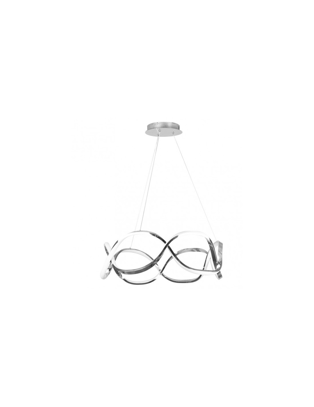 Colgante serie Nudo de color CROMO. Este moderno colgante de LED INTEGRADO está realizado en aluminio y policarbonato. Se caracteriza por su diseño suspendido por tres cables con formas curvas entrelazadas y aspecto brillante en su exterior resultando un anillo lumínico muy interesante. Sus dimensiones, regulables en altura son de 30<,90x55x55 centímetros. Su potencia es de 60 W, con 4800 lúmenes y 4000K de LUZ NATURAL. De esta misma serie puede encontrar varios diseños originales y de distintos tamaños para a adaptar a cualquier estancia.