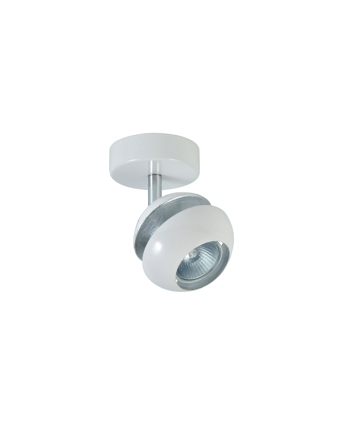 Foco de la serie BEETHOVEN en color BLANCO/PLATA. Realizado en metal con un portalámparas GU10 . Bombilla no incluida. De diseño moderno y original, combinando el blanco con la terminación en pan de plata, con foco redondeado y articulable verticalmente, con un giro horizontal de casi 360º permitiendo así dirigir el punto de luz hacia cualquier zona de la estancia. Sus dimensiones son 14X13X8,5 centímetros. Modelo también disponible en color negro/oro, tanto en su versión de regleta de cuatro luces, regleta de tres luces, regleta de dos luces, colgantes de tres y cuatro luces como en plafón de tres luces.