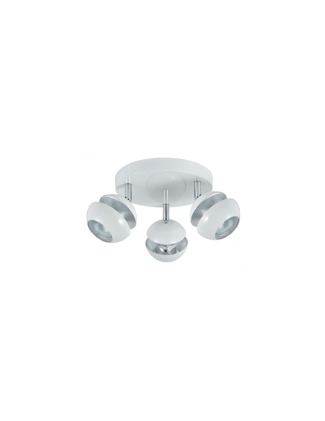 Plafón con tres focos de la serie BEETHOVEN en color BLANCO/PLATA. Realizado en metal con tres portalámparas GU10 . Bombillas no incluidas. De diseño moderno y original, combinando el blanco con la terminación en pan de plata, con focos redondeados y articulables verticalmente, con un giro horizontal de casi 360º permitiendo así dirigir los puntos de luz hacia cualquier zona de la estancia. Sus dimensiones son 14X22X22 centímetros. Modelo también disponible en color negro/oro, tanto en su versión de regleta de cuatro luces, regleta de tres luces, regleta de dos luces, colgantes de tres y cuatro luces como en foco de una luz.