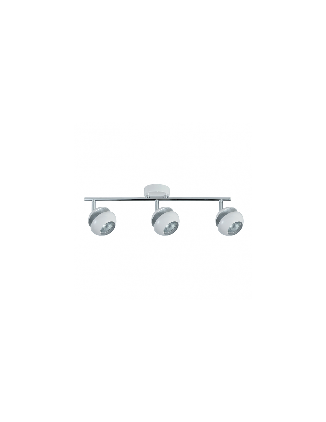 Regleta con tres focos de la serie BEETHOVEN en color BLANCO/PLATA. Realizada en metal con tres portalámparas GU10 . Bombillas no incluidas. De diseño moderno y original, combinando el blanco con la terminación en pan de plata, con focos redondeados y articulables verticalmente, con un giro horizontal de casi 360º permitiendo así dirigir los puntos de luz hacia cualquier zona de la estancia. Sus dimensiones son 14X48,5X8,5 centímetros. Modelo también disponible en color negro/oro, tanto en su versión de cuatro luces, dos luces, foco de una luz, colgantes de tres y cuatro luces como en plafón de tres luces.