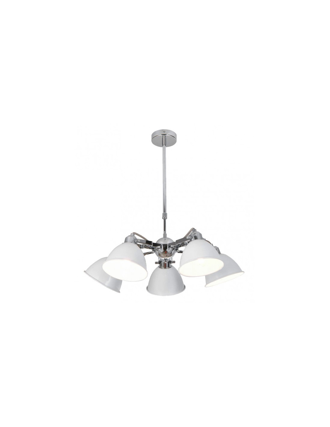 Lámpara serie BURI de cinco luces. Cuerpo central con cinco brazos realizado en metal de color CROMO y tulipas también metálicas y articulables de color BLANCO. Su diseño ofrece una versión sofisticada del estilo rústico urbano. Es ideal para grandes salones u hogares con estilos decorativos afines. Su dimensión, regulable en altura, es de 52<,81x52x52 centímetros. Posee cinco porta lámparas en E27. Bombillas no incluidas. De la misma serie, también disponible la lámpara de tres luces y la lámpara de dos luces para completar la colección.