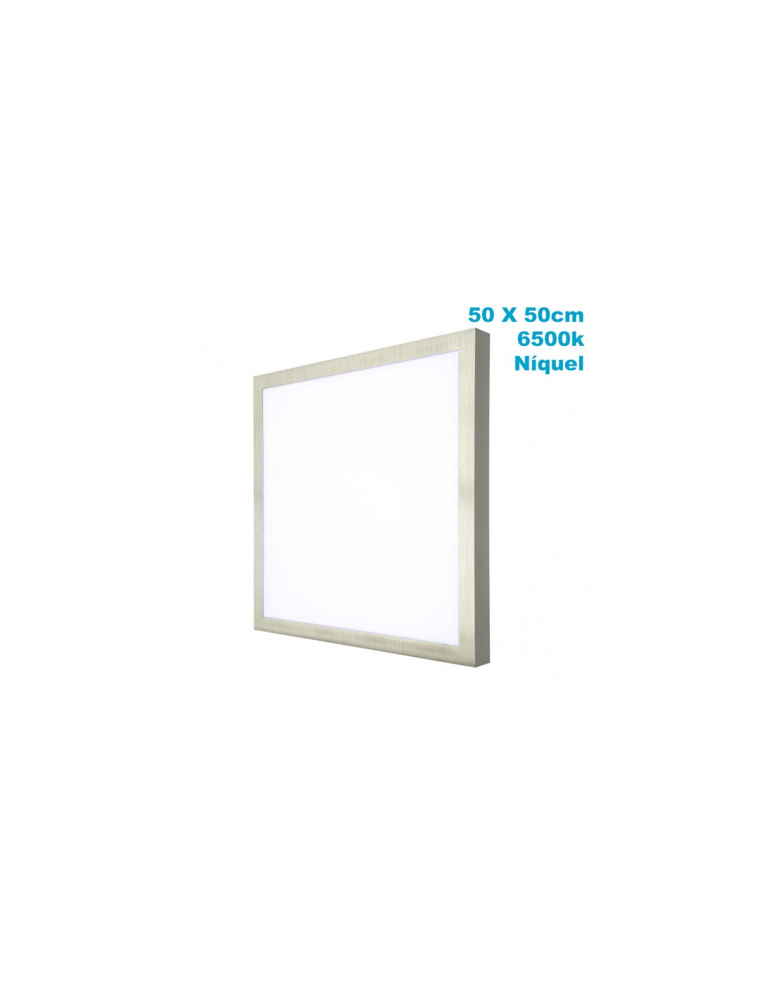 Panel de superficie de la serie PLANO en color NIQUEL. Realizado en aluminio y policarbonato. Tiene una potencia de 48 watios, 4080 lúmenes y 6500K de temperatura de luz, blanco frío. Tiene una medida de 3,5X50X50 centímetros y un peso neto de 1540 gramos. En esta serie podemos encontrar varios tamaños de paneles de superficie, con sus correspondientes potencias, tanto en color blanco como en níquel.