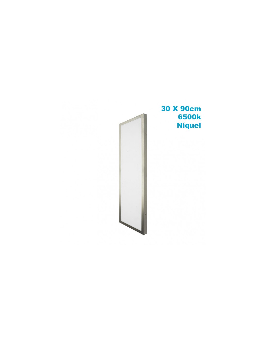 Panel de superficie de la serie PLANO en color NIQUEL. Realizado en aluminio y policarbonato. Tiene una potencia de 72 watios, 6120 lúmenes y 6500K de temperatura de luz, blanco frío. Tiene una medida de 3,5X30X90 centímetros y un peso neto de 1795 gramos. En esta serie podemos encontrar varios tamaños de paneles de superficie, con sus correspondientes potencias, tanto en color blanco como en níquel.