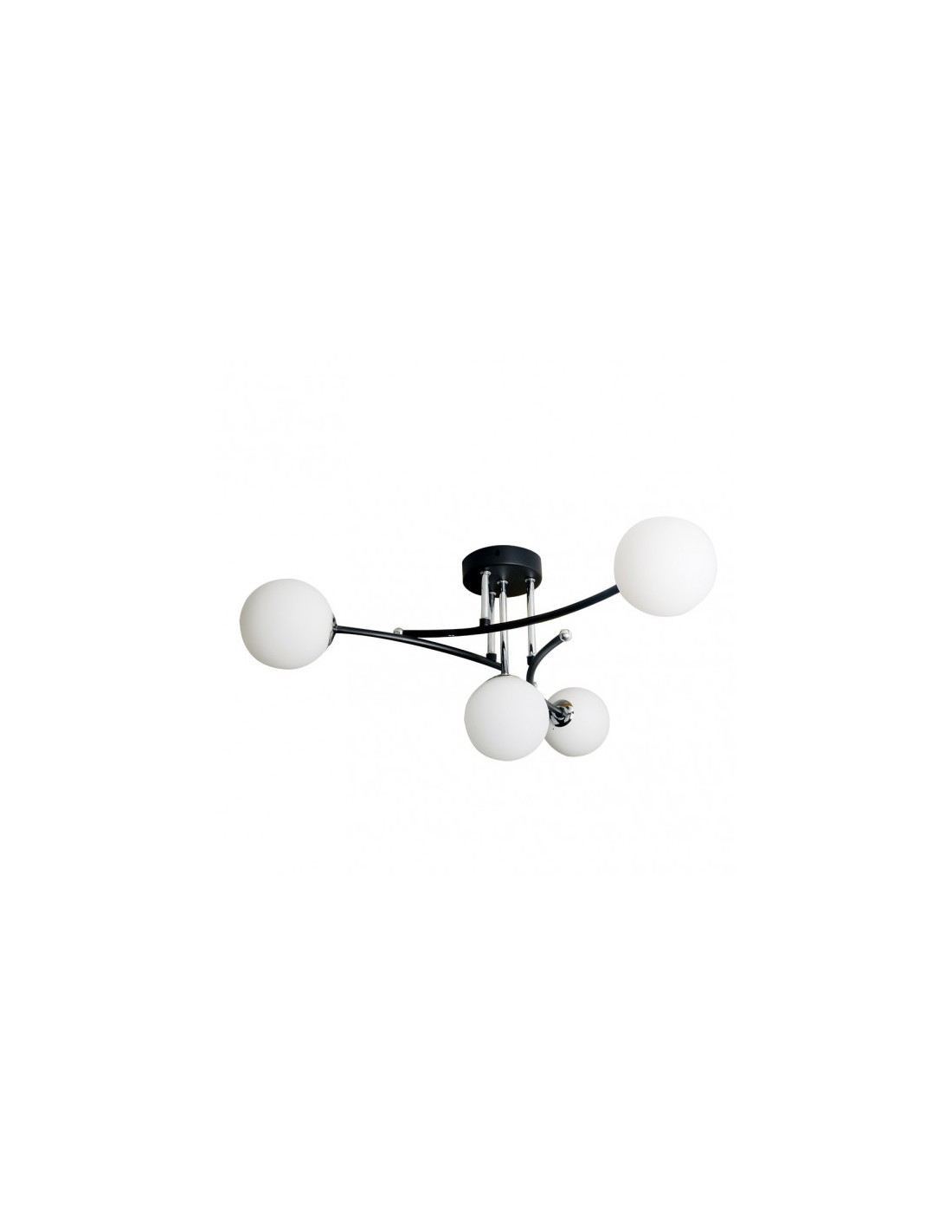 Lámpara de cuatro luces de la serie LA HABANA de color NEGRO/CROMO con tulipas de color blanco. De diseño original y moderno con cuerpo de metal y tulipas de cristal blanco. Sus dimensiones son de 25x59x59 centímetros. Posee cuatro porta lámparas G9. Bombillas no incluidas. La proyección de la luz a través del cristal da un toque cálido y difuso en general, ideal para decorar e iluminar cualquier estancia, ya sea de la casa o de trabajo. Está disponible también en la versión de la misma serie, la lámpara de cinco luces, sobremesa de dos luces y el pie de salón con dos luces, también los podemos encontrar todos los modelos en color blanco/cromo.