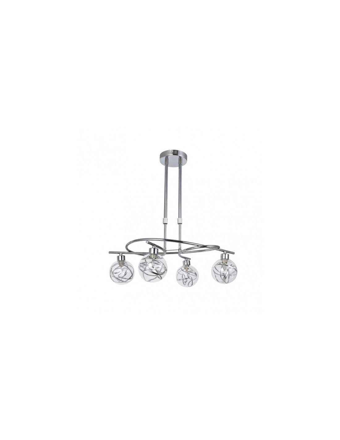 Lámpara de cuatro luces serie VARANASI, realizada en metal color CROMO y tulipas de cristal y metal. Diseño moderno y muy original, resaltando además de su forma, sus tulipas, en las que el cristal deja ver un entresijo de cintas de metal en su interior, resultando una composición muy especial para decorar tanto en salones como en dormitorios con un toque muy personal. Tiene unas dimensiones, regulables en altura, de 46<,68x50x32 centímetros. Posee cuatro porta lámparas en G9. Bombillas no incluidas. Puede completar la decoración de su hogar con la lámparas de seis luces, el plafón de cuatro y seis luces y el sobremesa. Todos los modelos también en color cuero.