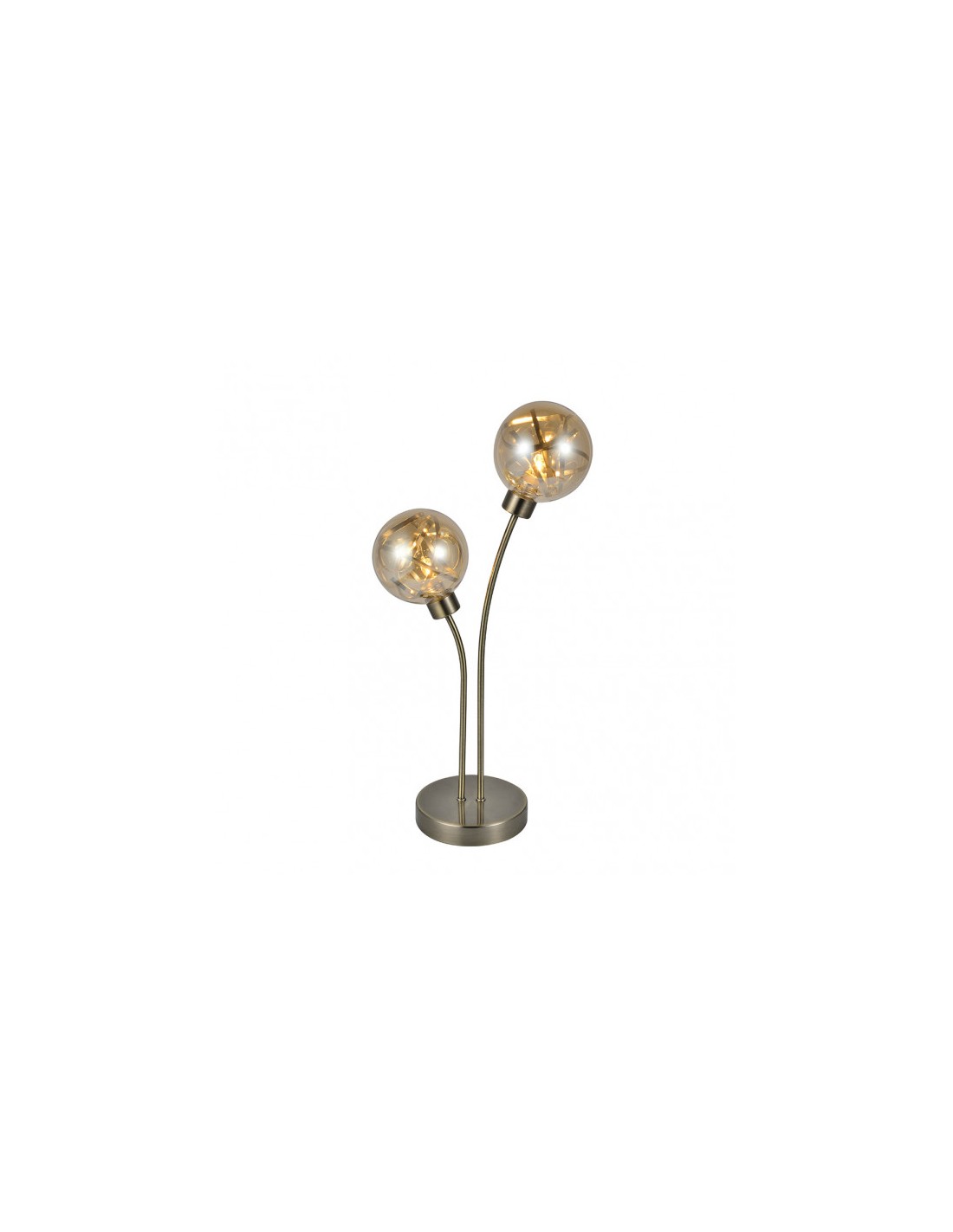 Sobremesa de dos luces serie VARANASI, realizada en metal color CUERO y tulipas de cristal ámbar y metal. Diseño moderno y muy original, resaltando además de su forma sus tulipas, en las que el cristal deja ver un entresijo de cintas de metal en su interior, resultando una composición muy especial para decorar cualquier rincón tanto en salones como en dormitorios con un toque muy personal. Tiene una dimensión de 46x27x13 centímetros y un peso neto 700 gramos. Posee dos porta lámparas en G9. Bombillas no incluidas. Puede completar la decoración de su hogar con las lámparas de cuatro y seis luces y los plafones de cuatro y seis luces. Todos los modelos también en color cromo.