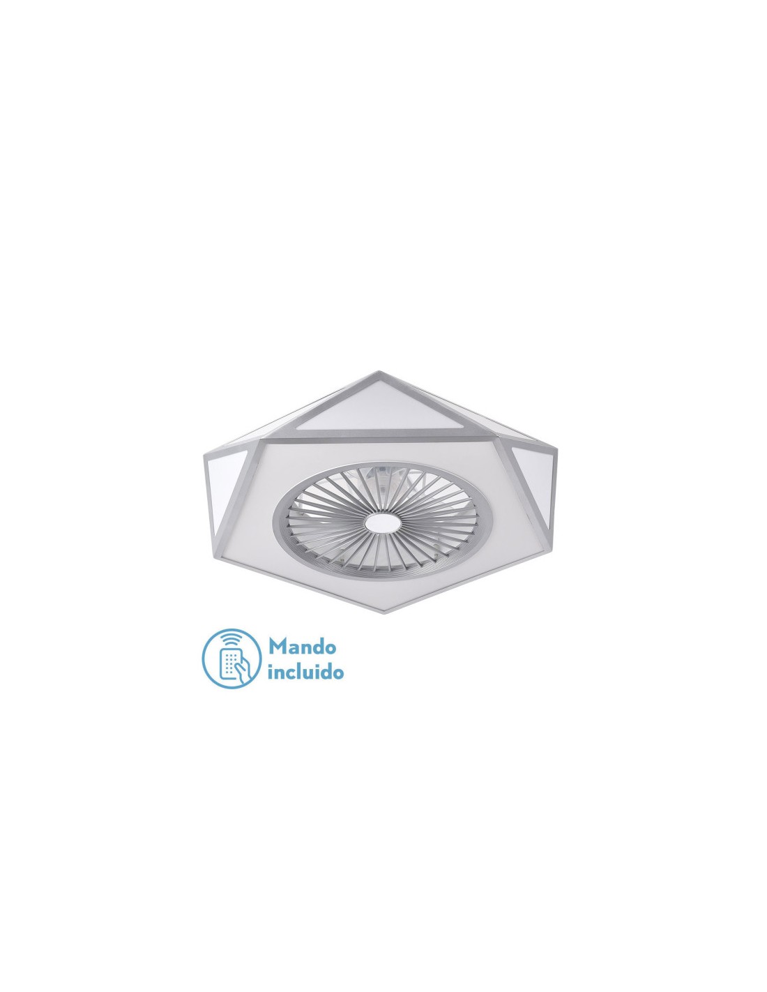 Ventilador serie ORA de color PLATA. Realizado en metal y policarbonato. Diseño moderno, con 5 aspas integradas en su estructura y 3 velocidades ajustables. Posee TECNOLOGÍA LED INTEGRADA con 80 watios de potencia, 6915 lúmenes, 3 temperatura de luz y REGULABLE EN INTENSIDAD, cálida, natural y luz blanco frío (3000ºk-4000ºk-6000ºk). Sus dimensiones son de 21X60X60 centímetros. Incluye MANDO A DISTANCIA, CON MEMORIA DE COLOR y TEMPORIZADOR 1/2/4 H. Modelo también disponible en color marrón.
