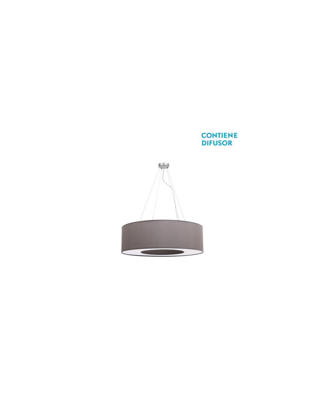 Colgante de techo pequeño de la serie HAITI en color CROMO/TOPO. Realizado en textil y metal. Destaca por su diseño moderno de pantalla cilíndrica con hueco central, como si fuera un gran anillo, viene acoplado también con su difusor. Ideal para decorar en salones, dormitorios y zonas de trabajo, haciéndose el centro de la habitación que ilumina. Posee cuatro portalámparas E27. Bombillas no incluidas. Tiene unas dimensiones, regulables en altura, de 40<,120x50x50 centímetros. En esta serie podemos encontrar a juego los colgantes de 50, 65 y 80 centímetros de diámetro y los sobremesas, todos en color negro, marrón, piedra, topo, madera gris y madera clara combinados con cromo para adaptar el que mejor quede con su decoración.