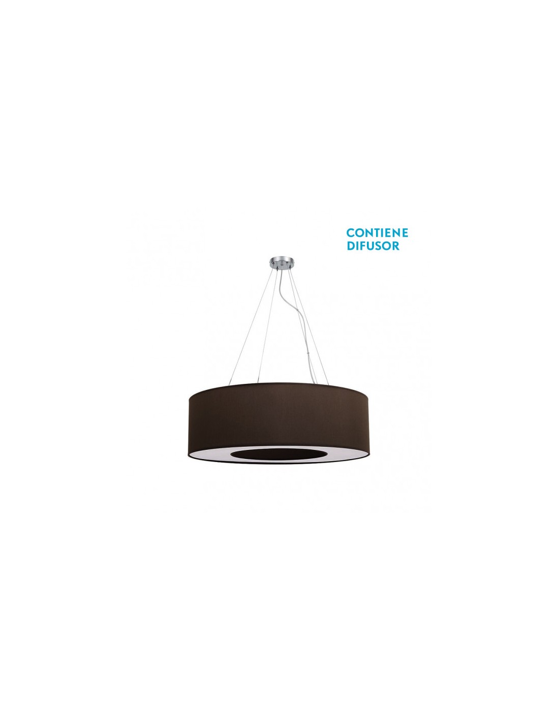Colgante de techo mediano de la serie HAITI en color CROMO/MARRON. Realizado en textil y metal. Destaca por su diseño moderno de pantalla cilíndrica con hueco central, como si fuera un gran anillo, viene acoplado también con su difusor. Ideal para decorar en salones y comedores, haciéndose el centro de la habitación que ilumina. Posee cuatro portalámparas E27. Bombillas no incluidas. Tiene unas dimensiones, regulables en altura, de 40<,120x65x65 centímetros. En esta serie podemos encontrar a juego los colgantes de 50, 65 y 80 centímetros de diámetro y los sobremesas, todos en color negro, marrón, piedra, topo, madera gris y madera clara combinados con cromo para adaptar el que mejor quede con su decoración.