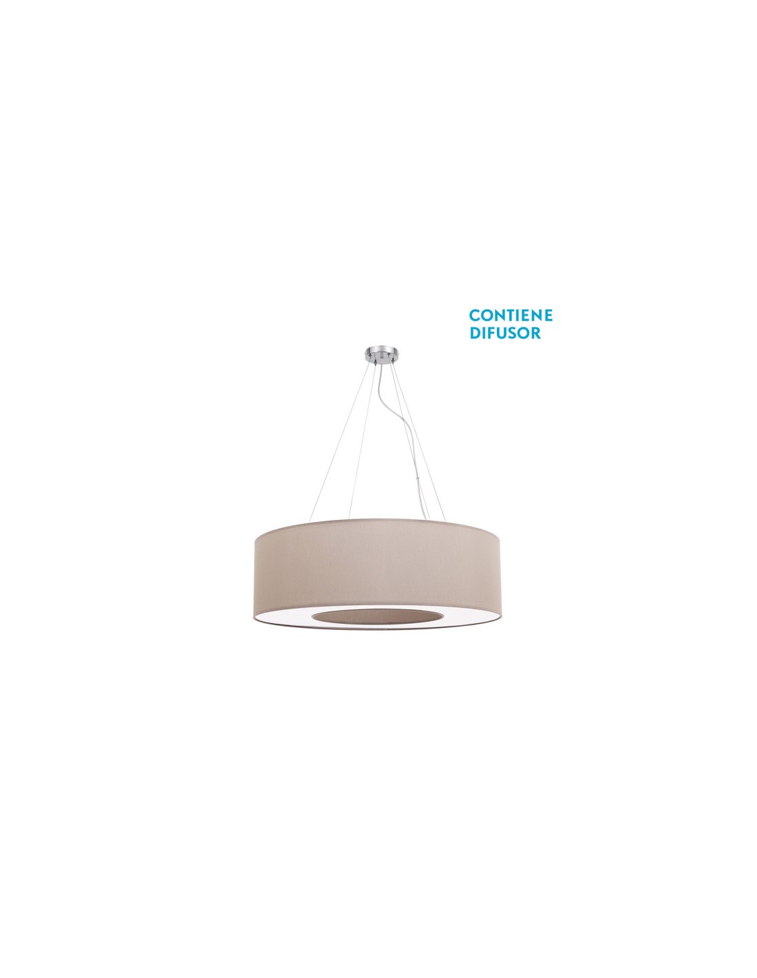 Colgante de techo mediano de la serie HAITI en color CROMO/PIEDRA. Realizado en textil y metal. Destaca por su diseño moderno de pantalla cilíndrica con hueco central, como si fuera un gran anillo, viene acoplado también con su difusor. Ideal para decorar en salones y comedores, haciéndose el centro de la habitación que ilumina. Posee cuatro portalámparas E27. Bombillas no incluidas. Tiene unas dimensiones, regulables en altura, de 40<,120x65x65 centímetros. En esta serie podemos encontrar a juego los colgantes de 50, 65 y 80 centímetros de diámetro y los sobremesas, todos en color negro, marrón, piedra, topo, madera gris y madera clara combinados con cromo para adaptar el que mejor quede con su decoración.