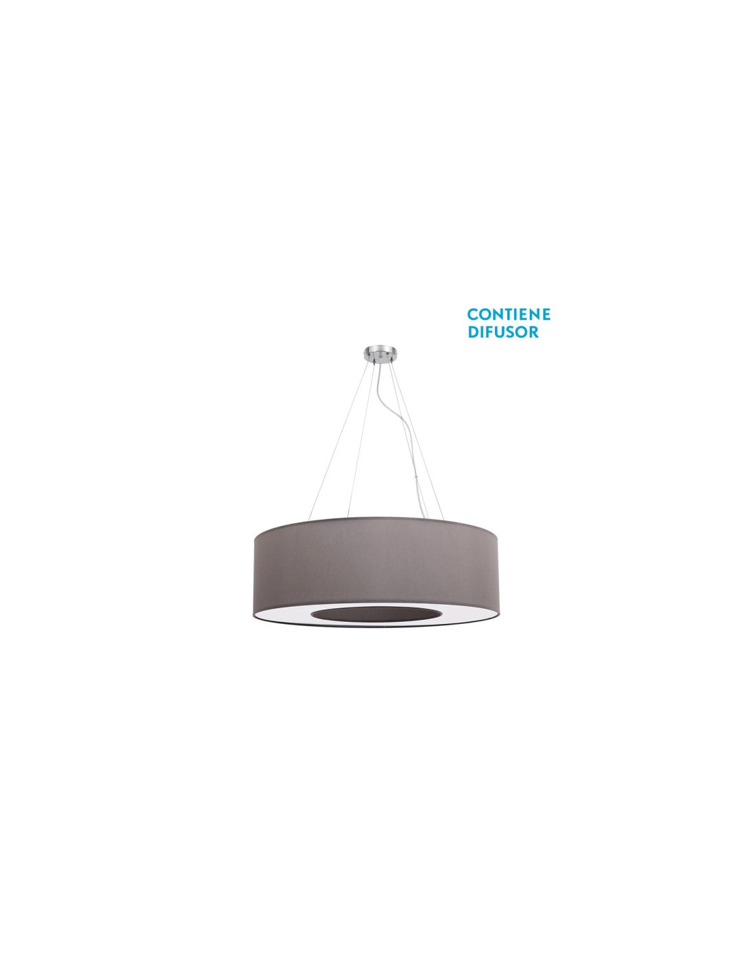 Colgante de techo mediano de la serie HAITI en color CROMO/TOPO. Realizado en textil y metal. Destaca por su diseño moderno de pantalla cilíndrica con hueco central, como si fuera un gran anillo, viene acoplado también con su difusor. Ideal para decorar en salones y comedores, haciéndose el centro de la habitación que ilumina. Posee cuatro portalámparas E27. Bombillas no incluidas. Tiene unas dimensiones, regulables en altura, de 40<,120x65x65 centímetros. En esta serie podemos encontrar a juego los colgantes de 50, 65 y 80 centímetros de diámetro y los sobremesas, todos en color negro, marrón, piedra, topo, madera gris y madera clara combinados con cromo para adaptar el que mejor quede con su decoración.