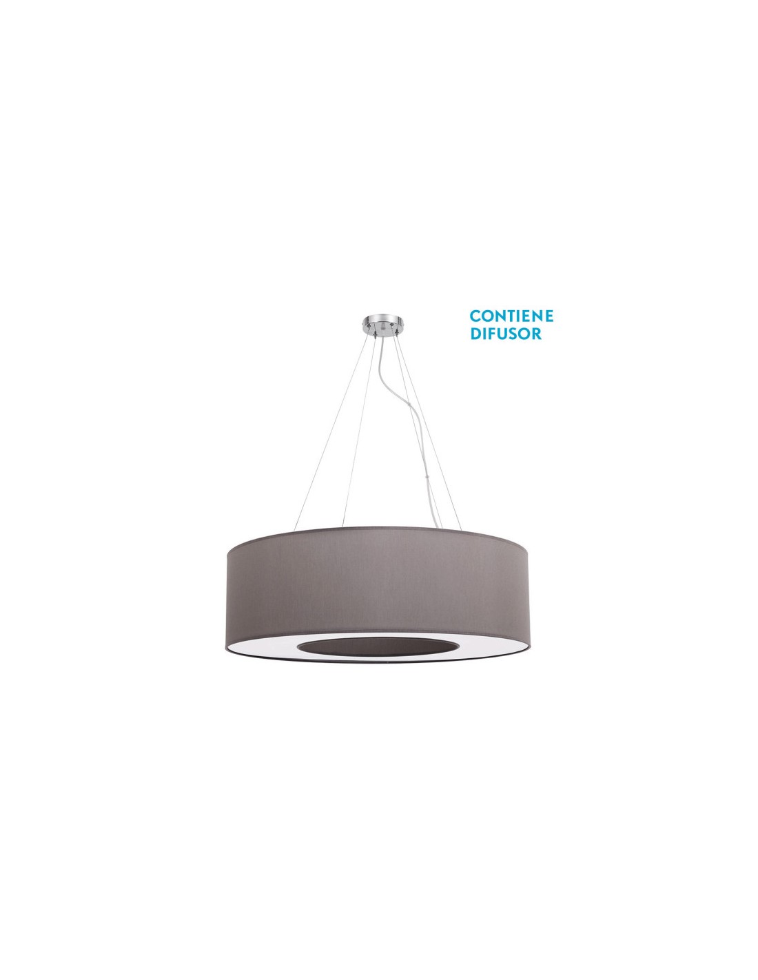 Colgante de techo de la serie HAITI en color CROMO/TOPO. Realizado en textil y metal. Destaca por su diseño moderno de pantalla cilíndrica con hueco central, como si fuera un gran anillo, viene acoplado también con su difusor. Ideal para decorar en salones y comedores de gran tamaño, haciéndose el centro de la habitación que ilumina. Posee cuatro portalámparas E27. Bombillas no incluidas. Tiene unas dimensiones, regulables en altura, de 40<,120x80x80 centímetros. En esta serie podemos encontrar a juego los colgantes de 50, 65 y 80 centímetros de diámetro y los sobremesas, todos en color negro, marrón, piedra, topo, madera gris y madera clara combinados con cromo para adaptar el que mejor quede con su decoración.