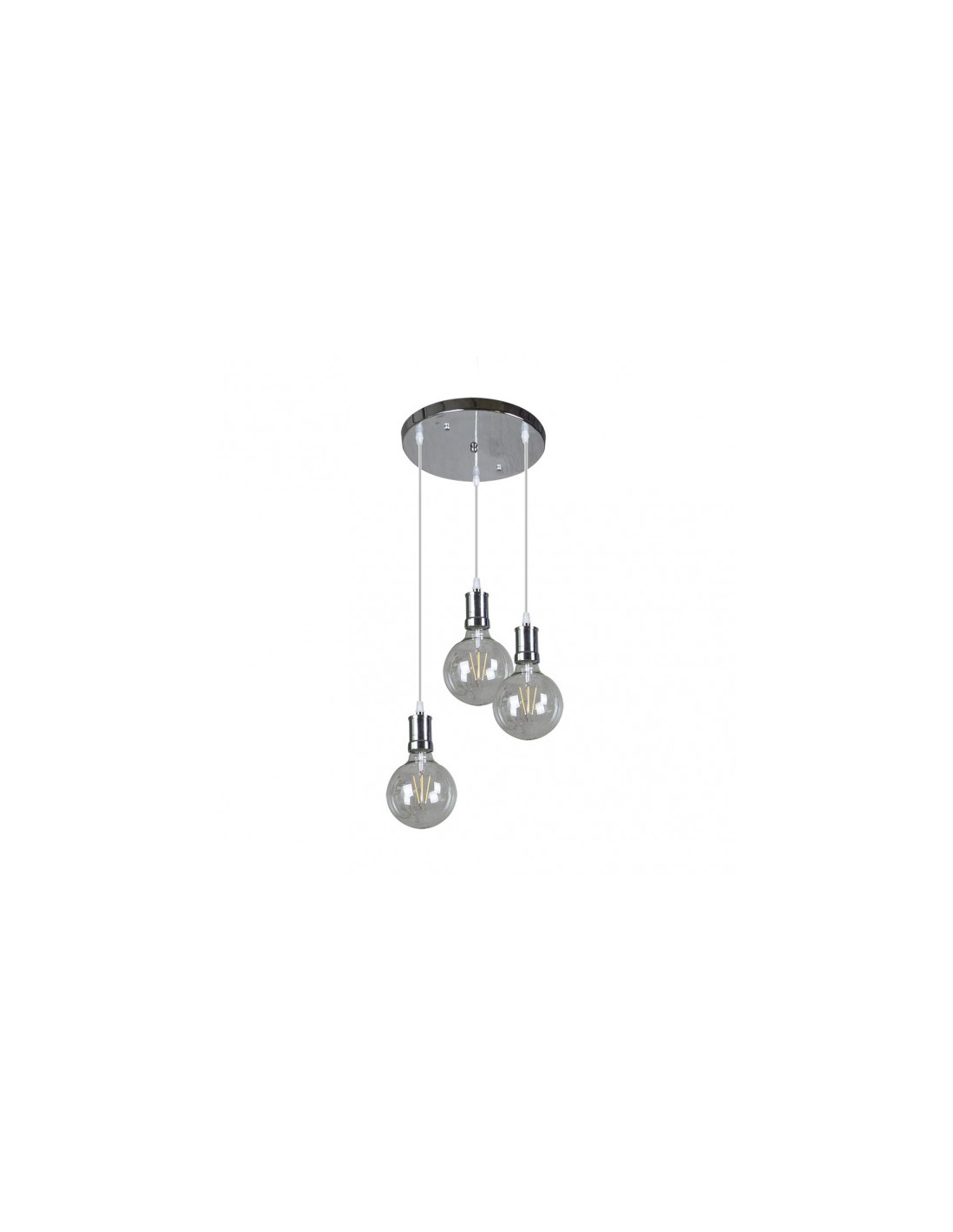 Colgante de tres luces de la serie PRISCO en color CROMO. Realizado en metal con un diseño original y moderno de tres bombillas LED globo transparentes, con filamentos, dispuestas en forma circular, con la opción de colgarlas a distintas alturas, creando así una composición única, con una potencia de 24 watios, 2550 lúmenes y una temperatura de 2700K (luz cálida). Trae las BOMBILLAS DECORATIVAS INCLUÍDAS, con tres portalámparas E27, pudiéndose en cualquier momento cambiársele las bombillas a la estructura con lo que cambiaríamos la estética y la luz de la lámpara. Ideal para decoraciones modernas y Vintage, aptas para iluminar en salones y comedores, e incluso en zonas de trabajo. Tiene unas dimensiones regulables en altura, de 36<,118x36x36 centímetros. También disponible la lámpara de esta serie con los colgantes suspendidos en forma lineal.