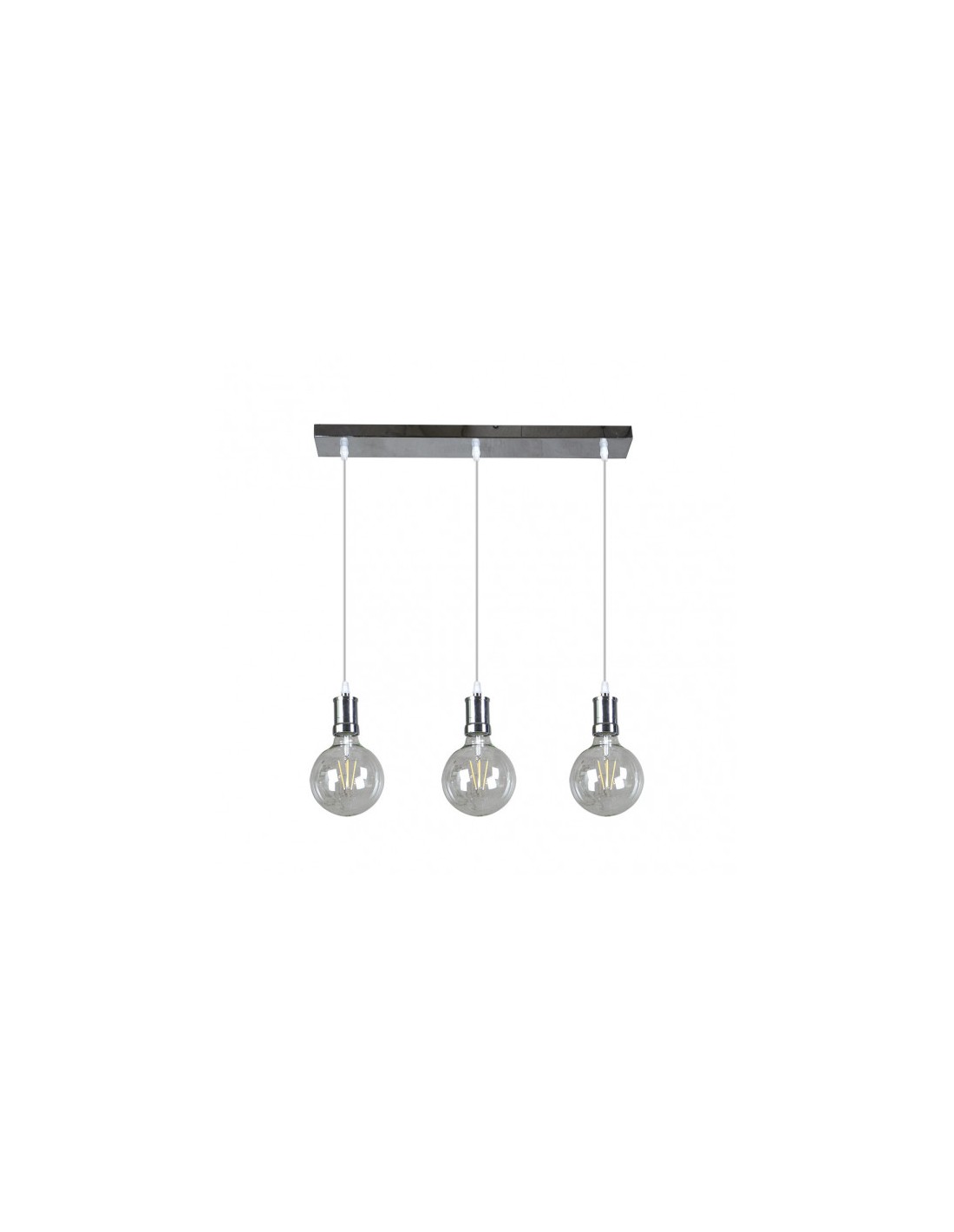 Colgante de tres luces de la serie PRISCO en color CROMO. Realizado en metal con un diseño original y moderno de tres bombillas LED globo transparentes, con filamentos, colocadas en línea, con la opción de colgarlas a distintas alturas, creando así una composición única, con una potencia de 24 watios, 2550 lúmenes y una temperatura de 2700K (luz cálida). Trae las BOMBILLAS DECORATIVAS INCLUÍDAS, con tres portalámparas E27, pudiéndose en cualquier momento cambiársele las bombillas a la estructura con lo que cambiaríamos la estética y la luz de la lámpara. Ideal para decoraciones modernas y Vintage, aptas para iluminar en salones y comedores, e incluso en zonas de trabajo. Tiene unas dimensiones regulables en altura, de 32<,113x64x12,5 centímetros. También disponible la lámpara de esta serie con los colgantes suspendidos en forma circular.