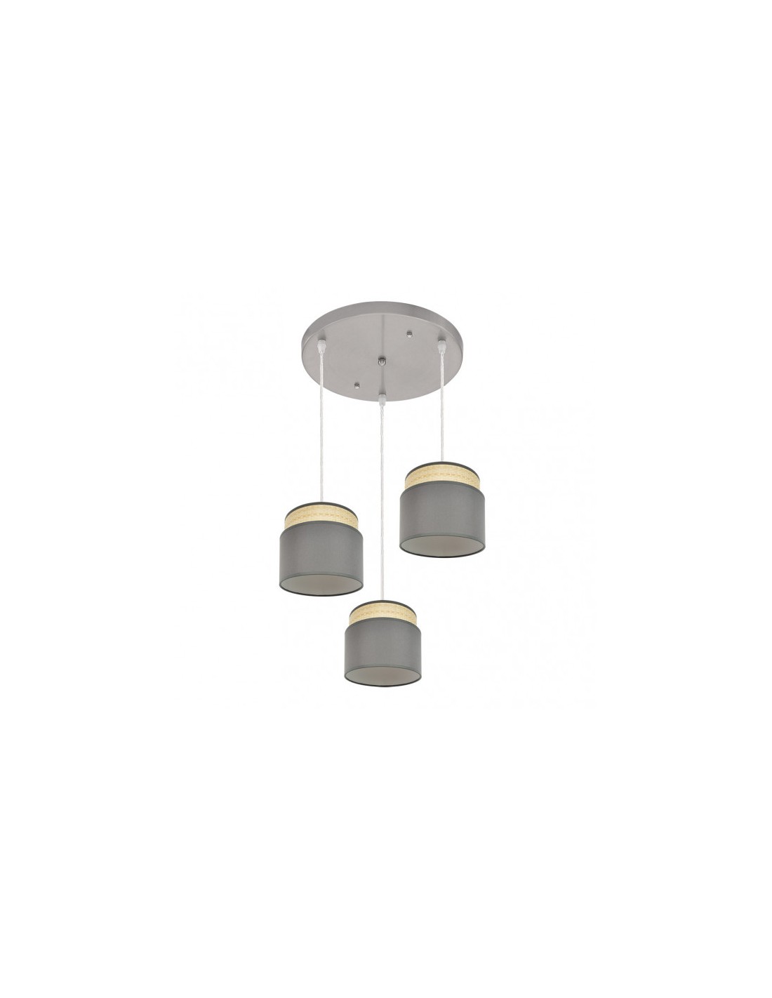 Plafón de tres colgantes de la serie KANDY de color NATURAL/GRIS. Posee tres portalámparas E27. Bombillas no incluidas. Pantallas formadas por dos cuerpos en textil y armazón metálico. De estilo moderno y diseño elegante, ideal para decorar e iluminar en dormitorios, salones y recibidores, aportando calidez a la estancia que ilumina. Sus dimensiones, regulables en altura, son de 45<,108x39x39 centímetros. En esta serie podemos encontrar los colgantes de 60, 50, 40 y 30 centímetros de diámetros, dos tamaños diferentes de sobremesas, los apliques, regleta de tres colgantes y el plafón de tres colgantes, todos combinando arpillera natural con textil en color blanco, negro, gris o marrón.