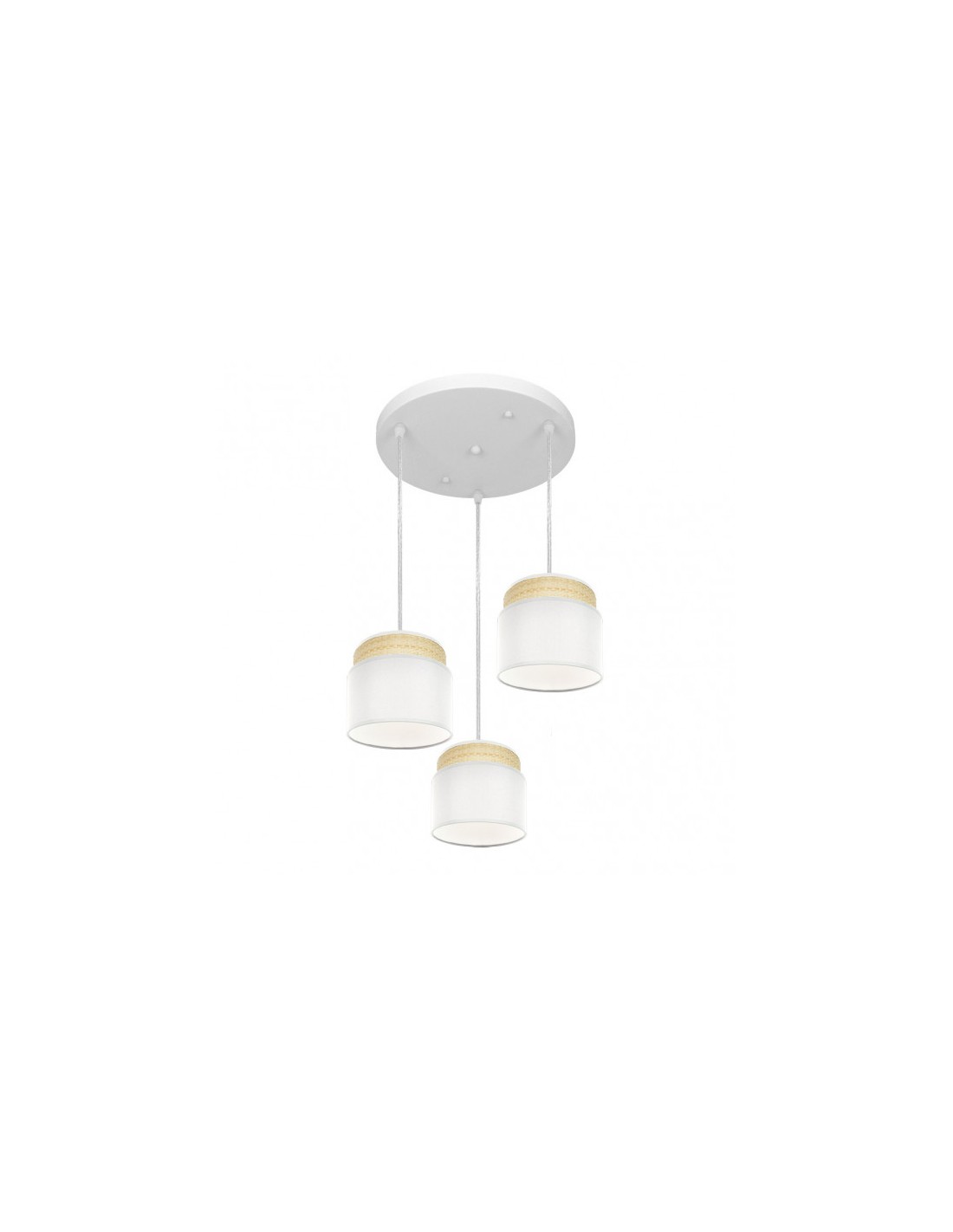 Plafón de tres colgantes de la serie KANDY de color NATURAL/BLANCO. Posee tres portalámparas E27. Bombillas no incluidas. Pantallas formadas por dos cuerpos en textil y armazón metálico. De estilo moderno y diseño elegante, ideal para decorar e iluminar en dormitorios, salones y recibidores, aportando calidez a la estancia que ilumina. Sus dimensiones, regulables en altura, son de 45<,108x39x39 centímetros. En esta serie podemos encontrar los colgantes de 60, 50, 40 y 30 centímetros de diámetros, dos tamaños diferentes de sobremesas, los apliques, regleta de tres colgantes y el plafón de tres colgantes, todos combinando arpillera natural con textil en color blanco, negro, gris o marrón.