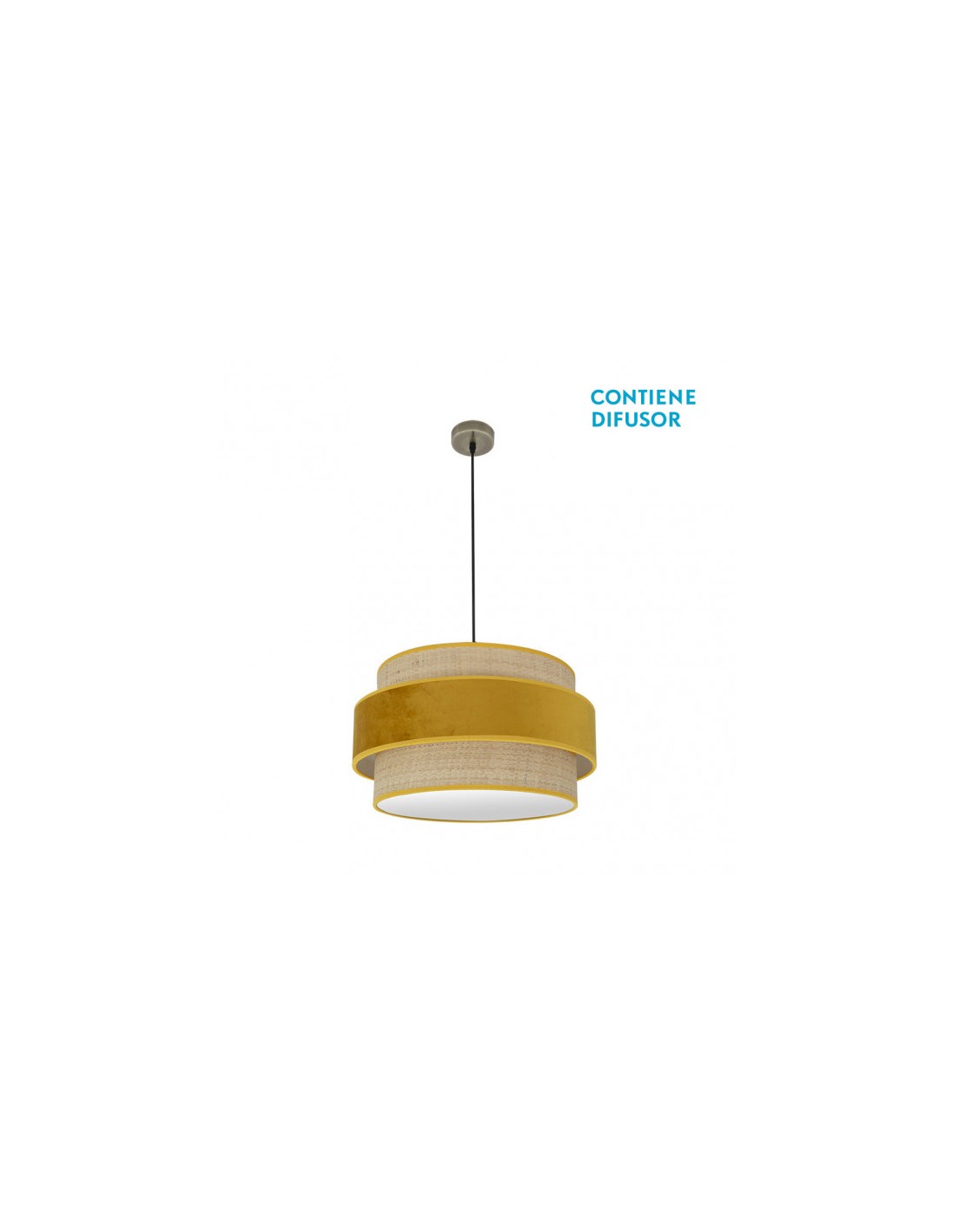 Colgante de diseño de la serie REYES de color CUERO con pantalla NATURAL/YEMA. Realizado en metal y textil. De estilo moderno, presenta en su pantalla un contraste de colores y texturas al combinar el terciopelo con tela de arpillera natural, resultando muy original y decorativo para iluminar en dormitorios, comedores, salones y zonas de trabajo, creando un ambiente diferente. Posee dos portalámparas E27. Bombillas no incluidas. Su pantalla tiene un diámetro de 50 centímetros y cogida de M10, colgante con altura regulable, tiene unas dimensiones de 43<,106x50x50 centímetros. En esta serie, encontramos a juego los colgantes de 30,40,50 y 60 centímetros de diámetro, el pie de salón, apliques y dos tamaños de sobremesas, todas las versiones combinando la arpillera natural con terciopelo de color marrón, rojo, verde ó yema, una amplia gama para elegir el que mejor se adapte a su decoración dando un toque de color a la estancia que ilumina.