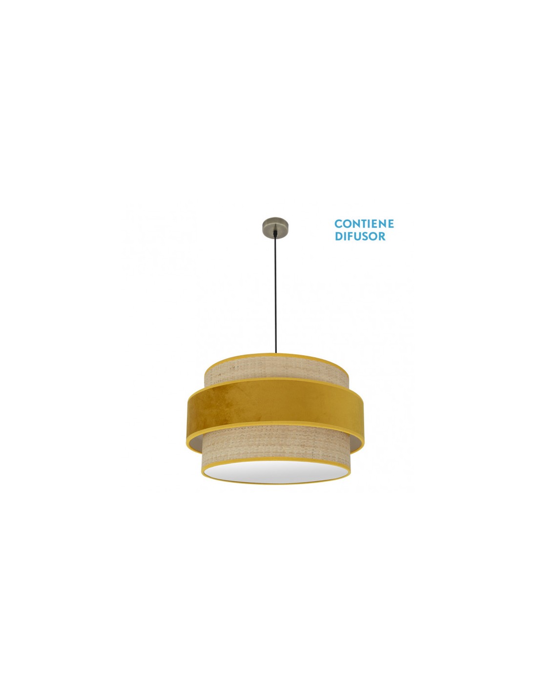 Colgante de diseño de la serie REYES de color CUERO con pantalla NATURAL/YEMA. Realizado en metal y textil. De estilo moderno, presenta en su pantalla un contraste de colores y texturas al combinar el terciopelo con tela de arpillera natural, resultando muy original y decorativo para iluminar en dormitorios, comedores, salones y zonas de trabajo, creando un ambiente diferente. Posee tres portalámparas E27, con cogida en su pantalla de M10. Bombilla no incluida. Su pantalla tiene un diámetro de 60 centímetros, con altura regulable, el colgante tiene unas dimensiones de 43<,106x60x60 centímetros. En esta serie, encontramos a juego los colgantes de 30,40,50 y 60 centímetros de diámetro, el pie de salón, apliques y dos tamaños de sobremesas, todas las versiones combinando la arpillera natural con terciopelo de color marrón, rojo, verde ó yema, una amplia gama para elegir el que mejor se adapte a su decoración dando un toque de color a la estancia que ilumina.
