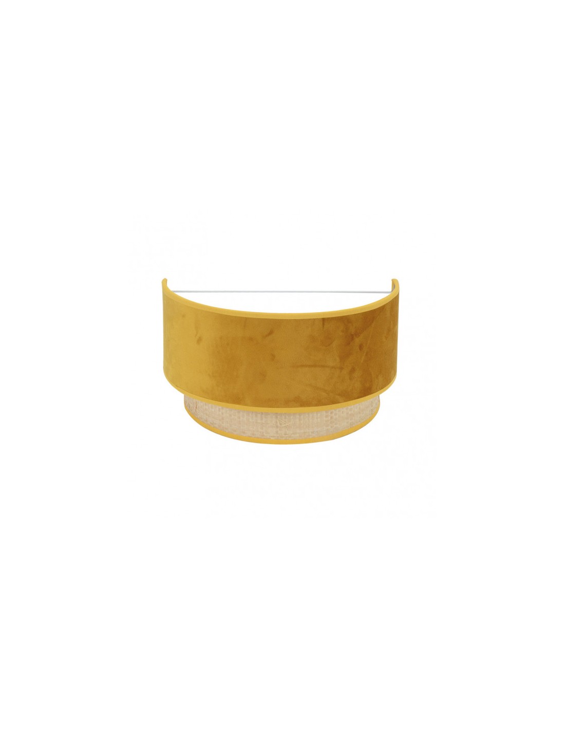 Aplique de diseño de la serie REYES de color NATURAL/YEMA. Realizado en metal y textil. De estilo moderno, presenta un contraste de colores y texturas al combinar el terciopelo con tela de arpillera natural, resultando muy original y decorativo para iluminar en dormitorios, entradas y zonas de trabajo, creando un ambiente diferente. Posee un portalámparas E27. Bombilla no incluida. Tiene unas dimensiones de 17x30x16 centímetros. En esta serie, encontramos a juego los colgantes de 30,40,50 y 60 centímetros de diámetro, el pie de salón, apliques y dos tamaños de sobremesas, todas las versiones combinando la arpillera natural con terciopelo de color marrón, rojo, verde ó yema, una amplia gama para elegir el que mejor se adapte a su decoración dando un toque de color a la estancia que ilumina.