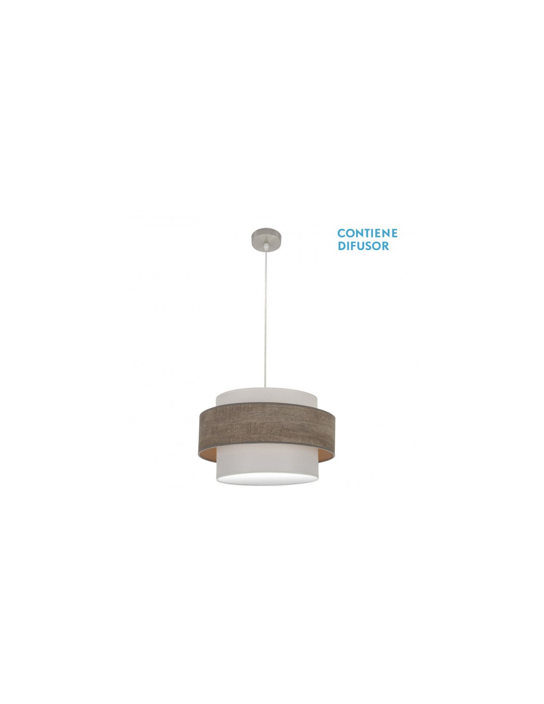 Colgante de diseño de la serie MYRIAM de color NIQUEL/MADERA GRIS. Realizado en metal y textil, de estilo moderno, presenta una combinación de colores y texturas, imitando a la madera, resultando una composición muy original y decorativa para iluminar en dormitorios, salones, comedores y zonas de trabajo, aportando claridad y amplitud a la estancia que decora. Posee dos portalámparas E27, con cogida en su pantalla de M10. Bombillas no incluidas. Su pantalla tiene 50 centímetros de diámetro, con unas dimensiones generales, de altura regulable, de 47<,110x50x50 centímetros. En esta serie, encontramos a juego los colgantes de 40 y 50 centímetros de diámetro, el pie de salón, aplique y el sobremesa, todas las versiones combinando el blanco con madera clara, madera gris, madera oscura ó madera negra, una amplia gama para elegir el que mejor se adapte a su decoración.