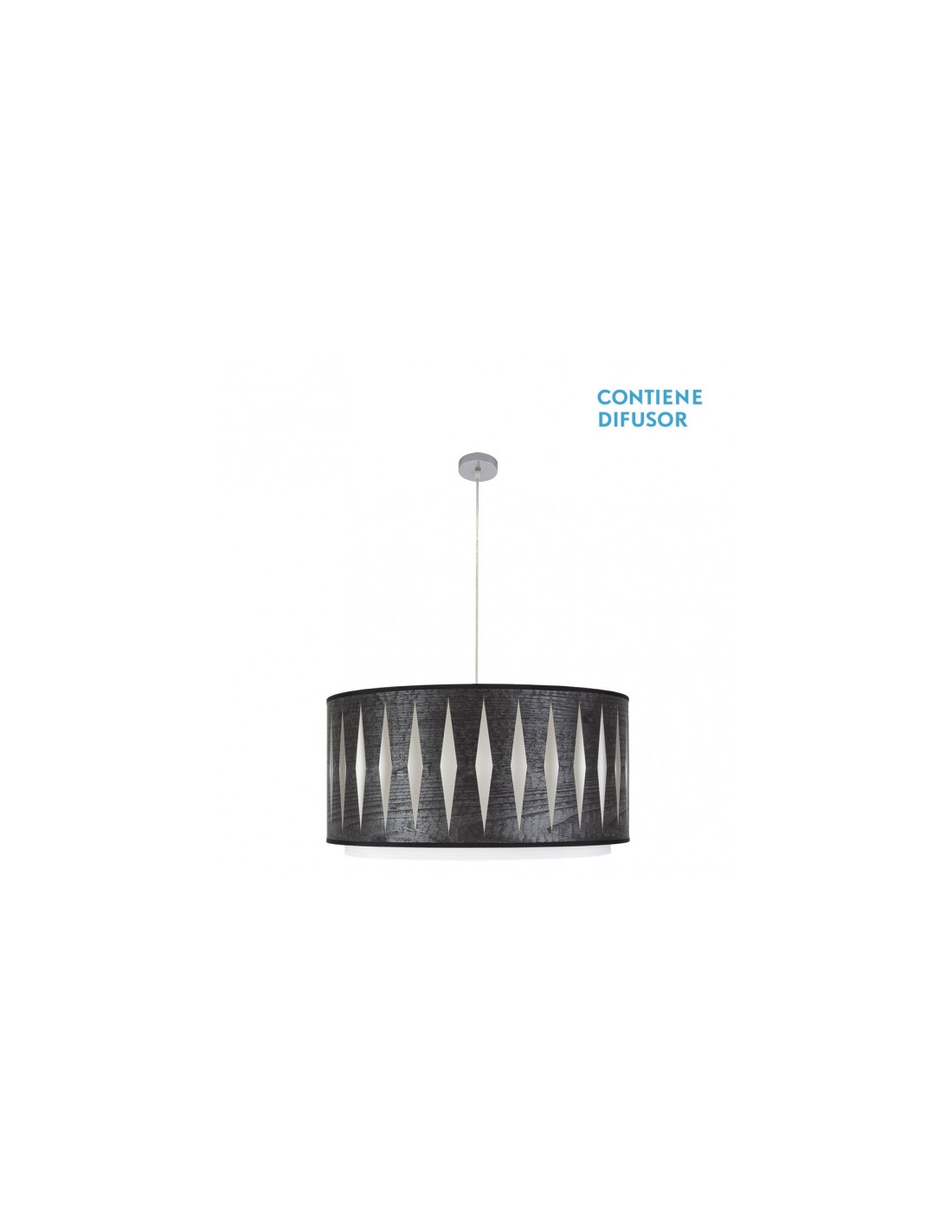 Colgante de la serie ALEXANDRA en color CROMO/MADERA NEGRA. Realizado en metal y textil. Se caracteriza por el diseño moderno del dibujo étnico que crea su doble pantalla calada y sus terminaciones simulando madera, resultando una bonita composición para decorar e iluminar cualquier estancia del hogar o lugar de trabajo. Posee tres portalámparas E27. Bombillas no incluidas. Tiene una dimensión regulable en altura de 44<,105x60x60 centímetros. En esta misma serie podemos encontrar los colgantes de 60, 50, 40 y 30 centímetros de diámetro, el pie de salón y dos tamaños de sobremesa. Todos también disponible en las combinaciones de colores madera clara, madera oscura, madera gris y madera negra.