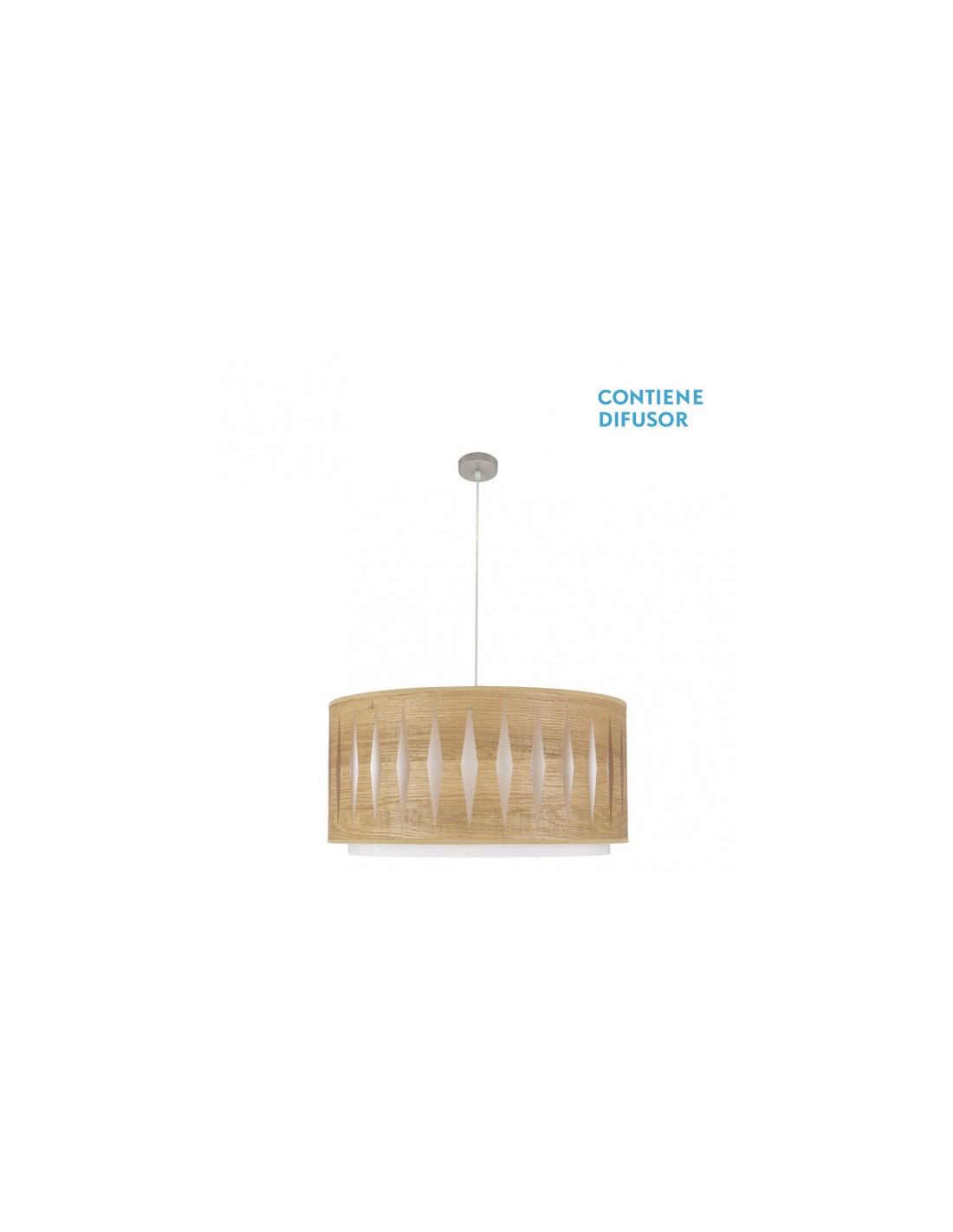 Colgante de la serie ALEXANDRA en color NIQUEL/MADERA CLARA. Realizado en metal y textil. Se caracteriza por el diseño moderno del dibujo étnico que crea su doble pantalla calada y sus terminaciones simulando madera, resultando una bonita composición para decorar e iluminar cualquier estancia del hogar o lugar de trabajo. Posee tres portalámparas E27. Bombillas no incluidas. Tiene una dimensión regulable en altura de 44<,105x60x60 centímetros. En esta misma serie podemos encontrar los colgantes de 60, 50, 40 y 30 centímetros de diámetro, el pie de salón y dos tamaños de sobremesa. Todos también disponible en las combinaciones de colores madera clara, madera oscura, madera gris y madera negra.