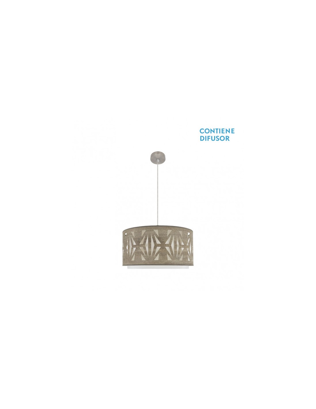 Colgante serie KATERINA en color NIQUEL/MADERA GRIS. Realizado en metal y textil, se caracteriza por el diseño moderno del dibujo que crea su pantalla calada, resultando una bonita composición para decorar e iluminar cualquier estancia del hogar o lugar de trabajo. Posee dos portalámparas E27. Bombilla no incluida. Tiene una dimensión regulable en altura de 44<,105x50x50 centímetros. En esta misma serie podemos encontrar los colgantes de 60, 50, 40 y 30 centímetros de diámetro, un pie de salón y dos modelos de sobremesa. Todos también disponible en las combinaciones de colores madera clara, madera oscura, madera gris y madera negra.