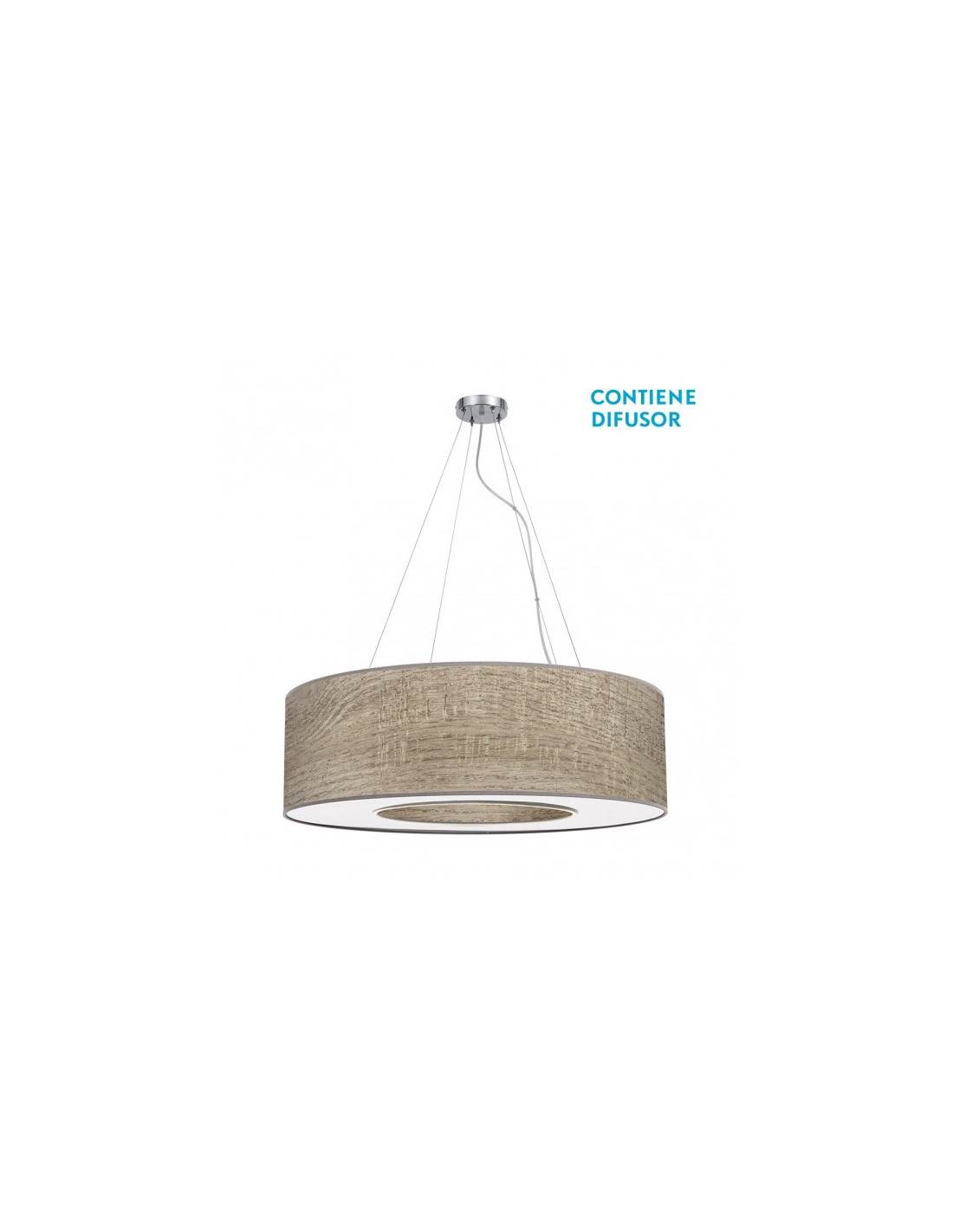Colgante de techo de la serie HAITI en color CROMO/MADERA GRIS. Realizado en textil y metal. Destaca por su diseño moderno de pantalla cilíndrica con hueco central, como si fuera un gran anillo, viene acoplado también con su difusor. Ideal para decorar en salones y comedores de gran tamaño, haciéndose el centro de la habitación que ilumina. Posee cuatro portalámparas E27. Bombillas no incluidas. Tiene unas dimensiones, regulables en altura, de 40<,120x80x80 centímetros. En esta serie podemos encontrar a juego los colgantes de 50, 65 y 80 centímetros de diámetro y los sobremesas, todos en color negro, marrón, piedra, topo, madera gris y madera clara combinados con cromo para adaptar el que mejor quede con su decoración.