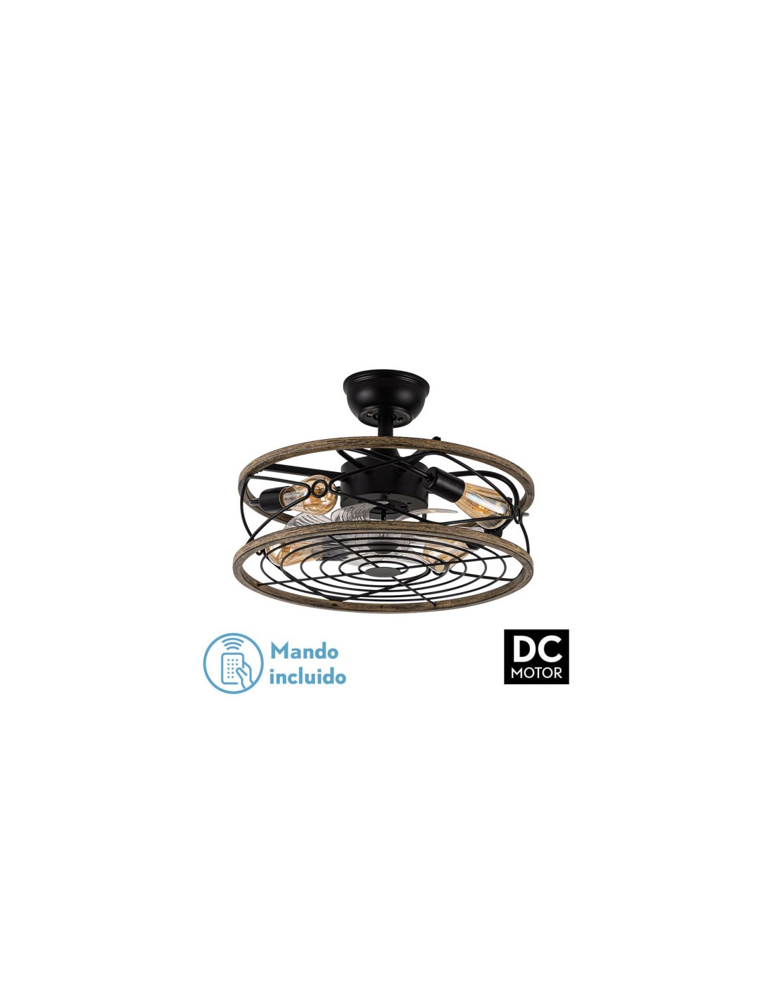 Ventilador ARCADIA realizado en metal y policarbonato con acabados en color NEGRO/MARRON con 8 aspas transparentes de ABS. Posee cuatro portalámparas E27. Bombillas no incluidas. Motor DC, con 6 velocidades. De diseño muy original, combinando en su estructura el metal con el acabado en madera. Ideal para ambientes rústicos y decoraciones industriales. Tiene una medida de 31/40x50x50 centímetros, con 2 MEDIDAS DE TIJAS incluidas para colocar a distintas alturas. Viene con mando a distancia INCLUIDO Y TEMPORIZADOR 1/2/4H.
