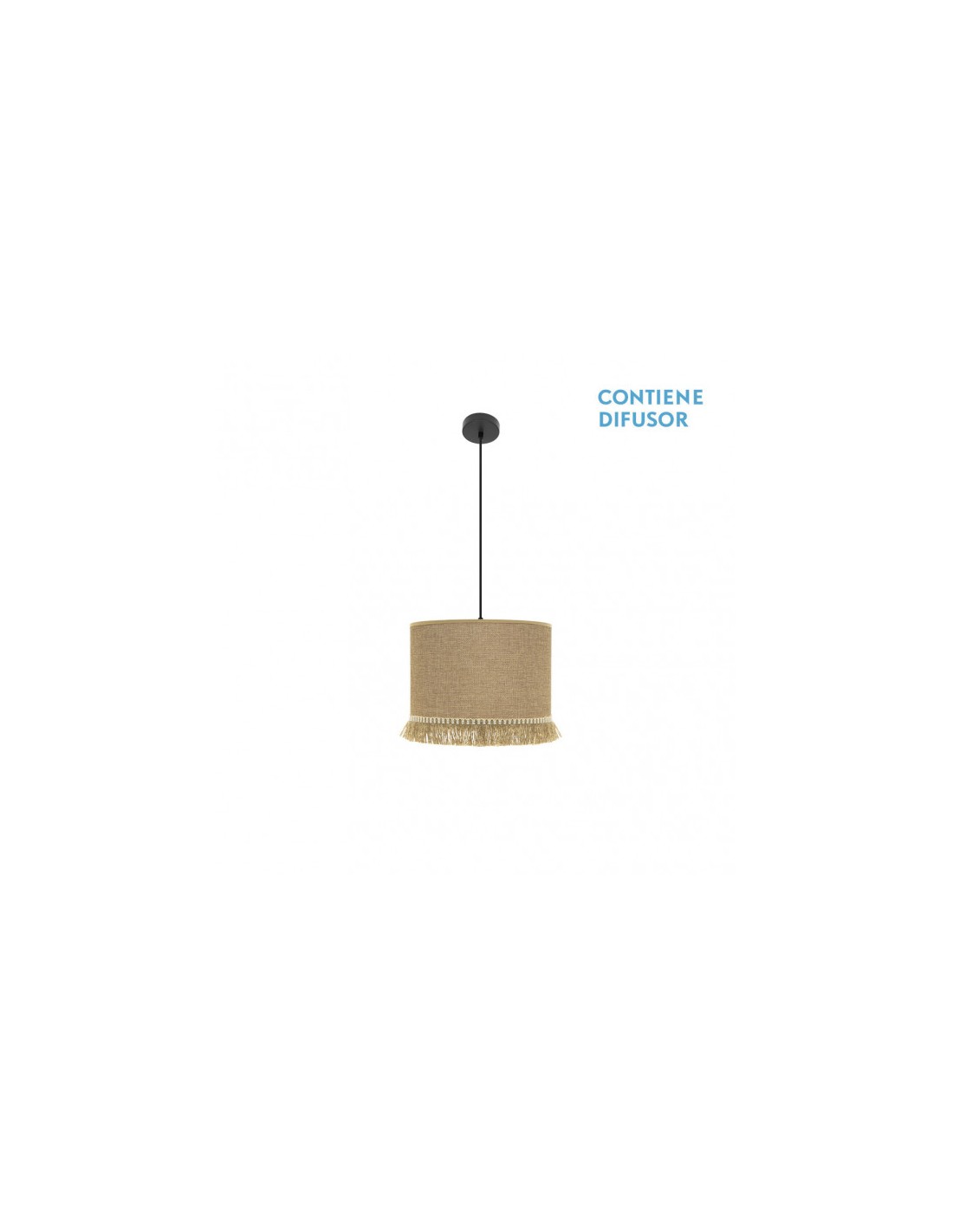 Colgante de la serie SIBILA de color NEGRO/ARENA de 50 centímetros de diámetro. Posee dos portalámparas E27, pantalla con cogida M10. Bombillas no incluidas. Con pantalla muy original, confeccionada en tela de saco-yute y con terminación de un pasamanería con flecos. De estilo moderno y diseño elegante, ideal para decorar e iluminar en dormitorios, salones y salas de estar, aportando calidez a la estancia que ilumina. Sus dimensiones son regulable en altura, de 50<,113x50x50 centímetros. En esta serie podemos encontrar los colgantes de 60, 50 y 40 centímetros de diámetros, dos tamaños diferentes de sobremesas, y el pie de salón, todos combinando el tejido de saco con negro o cuero.