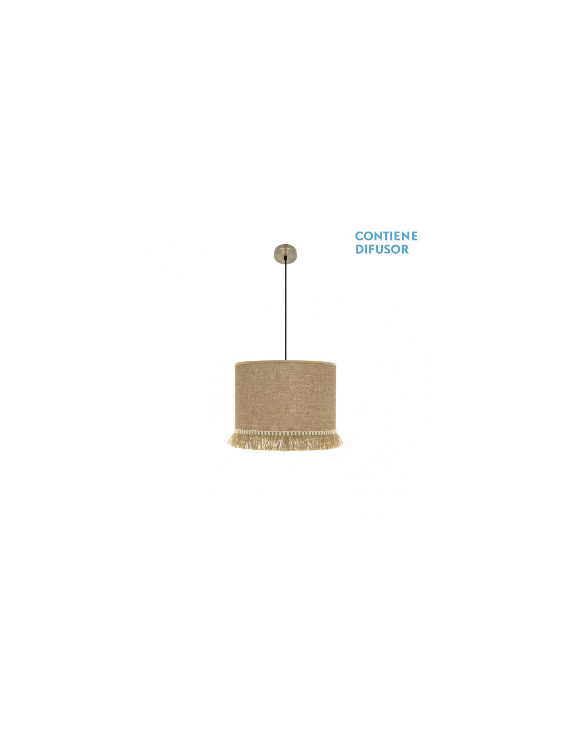 Colgante de la serie SIBILA de color CUERO/ARENA de 60 centímetros de diámetro. Posee tres portalámparas E27, pantalla con cogida M10. Bombillas no incluidas. Con pantalla muy original, confeccionada en tela de saco-yute y con terminación de un pasamanería con flecos. De estilo moderno y diseño elegante, ideal para decorar e iluminar en dormitorios, salones y salas de estar, aportando calidez a la estancia que ilumina. Sus dimensiones son regulable en altura, de 55<,118x60x60 centímetros. En esta serie podemos encontrar los colgantes de 60, 50 y 40 centímetros de diámetros, dos tamaños diferentes de sobremesas, y el pie de salón, todos combinando el tejido de saco con negro o cuero.