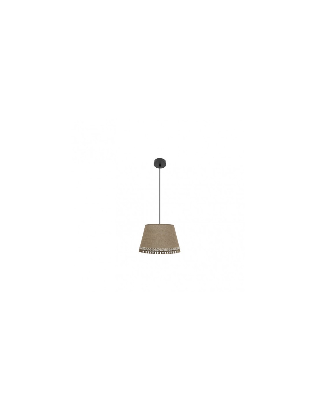 Colgante de la serie ADA de color NEGRO/ARENA. Posee un portalámparas E27. Bombilla no incluida. Con pantalla cónica muy original, confeccionada en tela de saco y terminado con una bonita pasamanería de flecos. De estilo moderno y diseño elegante, ideal para decorar e iluminar en dormitorios, entraditas, salones y salas de estar, aportando calidez a la estancia que ilumina. Tiene unas dimensiones, regulable en altura, de 47<,110x40x40 centímetros. En esta serie podemos encontrar los colgantes de 35 y 40 centímetros de diámetros, dos tamaños diferentes de sobremesas, y el pie de salón, todos combinando el tejido de saco con negro o cuero.