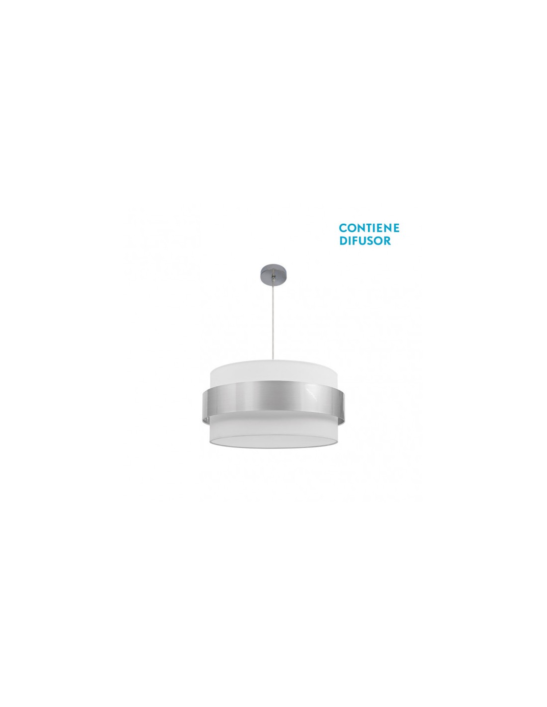 Colgante de la serie BREMEN en color CROMO y pantalla BLANCO/PLATA de 50 centímetros de diámetro. Posee tres portalámparas E27. Bombillas no incluidas. Sus dimensiones, regulables en altura, son de 40<,100x50x50 centímetros. Está realizado en material textil y metal. Puede completar la serie con la lámpara de tres y cuatro luces en color cromo, el colgante de 40 cm de diámetro y sobremesa, todas las versiones con pantallas en blanco/plata o en marrón/oro.