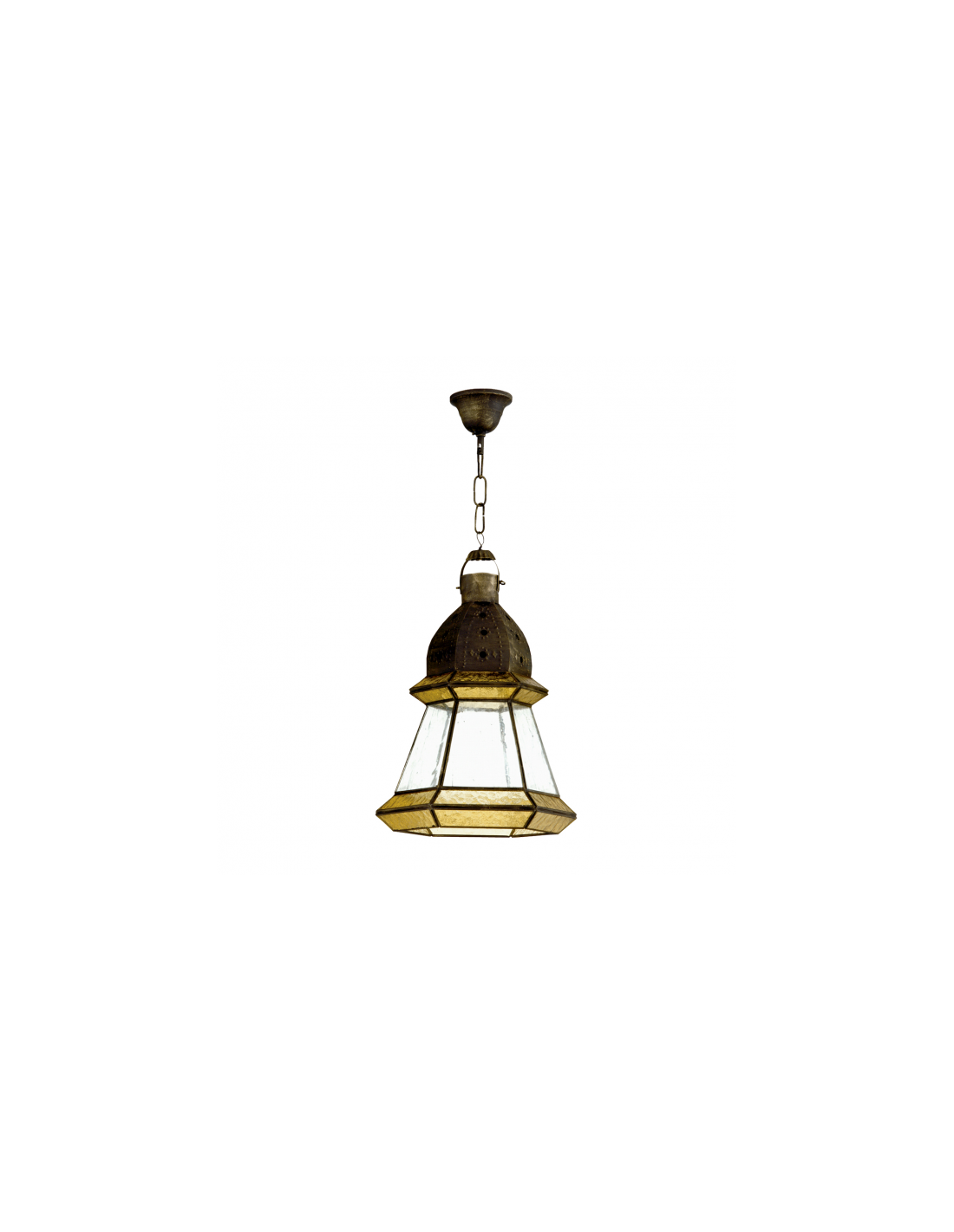 Colgante grande de la serie AMBARINA en color CUERO/AMBAR. Realizado en cristal y metal. Su diseño está inspirado en el arte califal. Sus dimensiones, regulable en altura, son de 60<,75x30x30 centímetros, teniendo el farol una altura de 45 centímetros y el portalámparas E27. Esta destinado para interiores o exteriores cubiertos. Destaca sus orificios en forma de estrella. Podemos encontrar en esta misma serie colgantes, apliques y plafones de distintos diseños pero fieles al estilo, pudiéndose crear la combinación perfecta en el hogar al que iluminen.