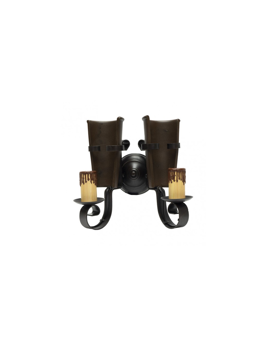 Aplique de dos luces de la serie CANTINA en color MARRON RUSTICO. Realizado en metal y teja de resina, con portavelas de policarbonato. Presenta un estilo rústico ideal para casas de campo y bodegones. Utiliza dos portalámparas E27. Bombillas no incluidas. Se recomienda bombillas Led en forma de vela para preservar la estética del diseño del aplique y conseguir un mayor ahorro en el consumo. Tiene unas dimensiones de 30x26x16 centímetros. En esta serie podemos encontrar lámparas de tres, cinco y seis luces y los apliques de una y dos luces.