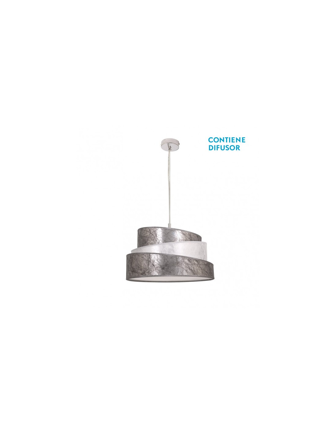 Colgante de la serie COLONIA en color PLATA/BLANCO de 40 centímetros de diámetro. Realizado en metal y textil. Destaca por su diseño original y moderno, con su pantalla combinando colores y texturas y con sus formas inclinadas. Utiliza tres portalámparas E27. Bombillas no incluidas. Tiene unas dimensiones, regulables en altura, de 30<,85x40x40 centímetros. En esta serie podemos encontrar el colgante de 40 cm y 50 cm de diámetro y el pie de salón a juego, todos en plata/blanco o en gris/topo.