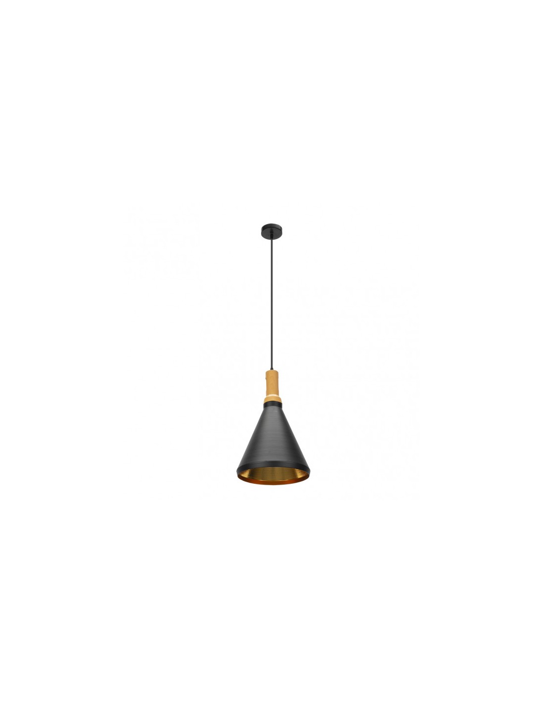 Moderno colgante serie GERMANO realizado en metal, está decorado arriba en color madera y la pantalla en color negro y oro. Se puede regular entre 52 y 120 centímetros de altura y su diámetro es de 25 centímetros. Tiene un peso de 460 gramos y su portalámparas es E27.