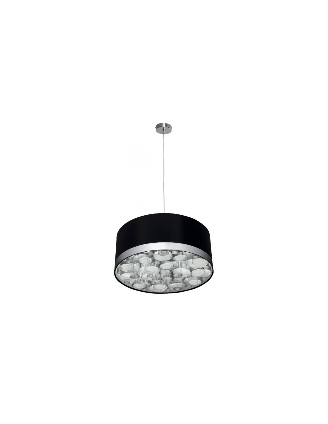 Colgante de la serie ABERDEEN con florón circular en metal cromado y pantalla textil de color negro con cinta cromo. Su altura es regulable entre 35 y 100 centímetros, diámetro 50 centímetros. Tiene un peso neto de 1380 gramos y su portalámparas es E27.